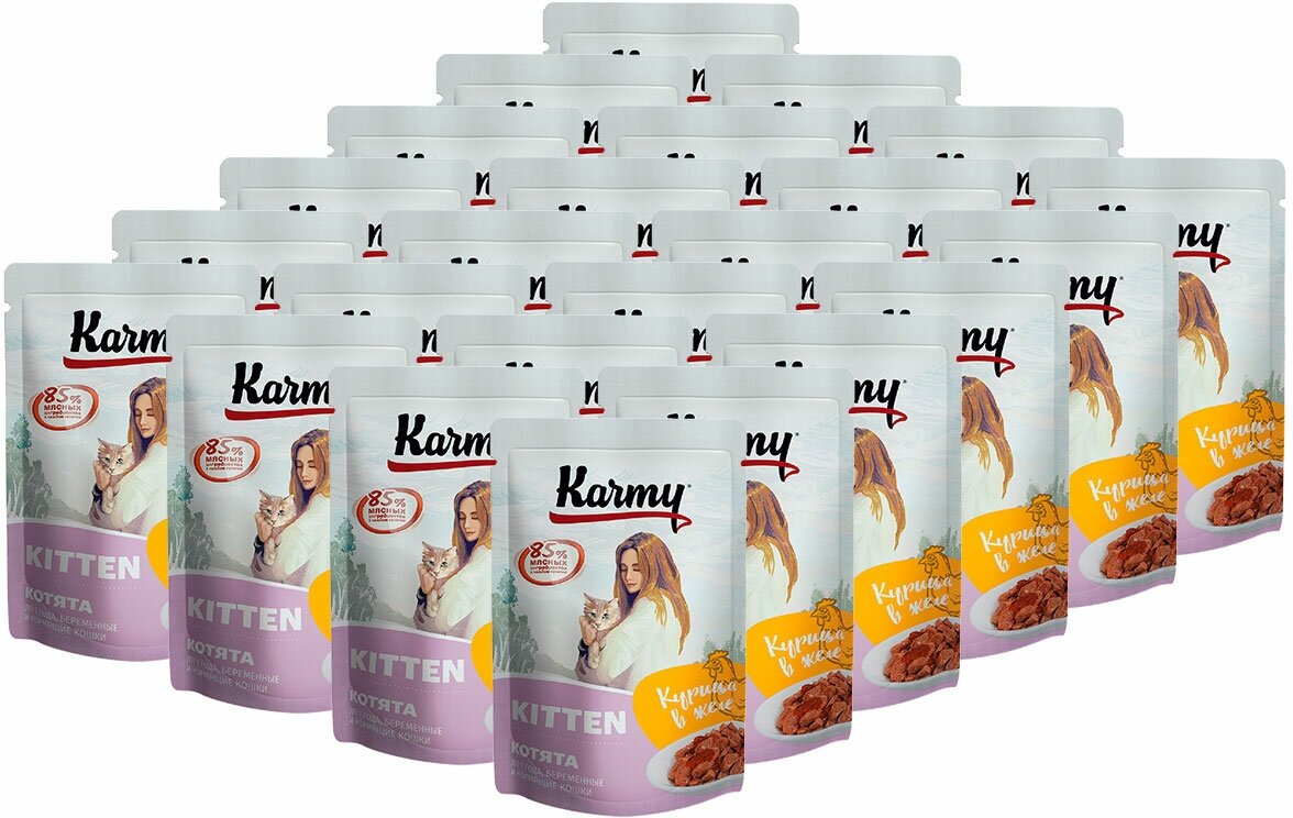 Влажный корм для котят и беременных кошек Karmy Kitten, курица 24 шт. х 80 г (кусочки в желе)