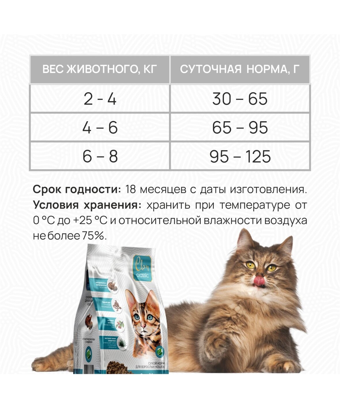 | Дозировка | Вес животного 2-4кг -суточная норма 25-55г Вес животного 4-6кг -суточная норма 55-85г Вес животного 6-8кг -суточная норма 55-115г Переход с предыдущего рациона следует осуществлять постепенно небольшими порциями в течение 5-7 дней |