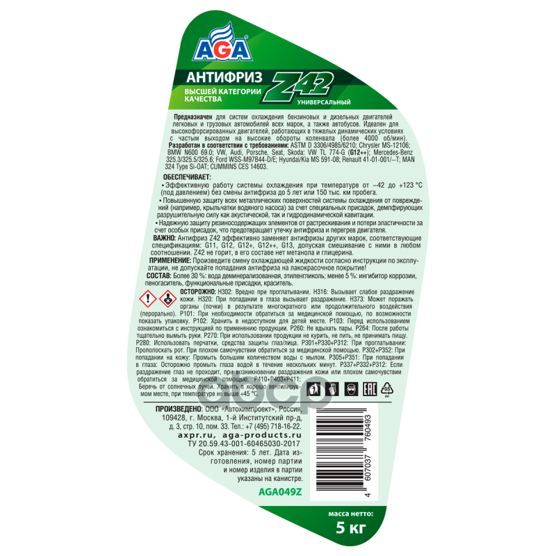Антифриз Зеленый Z-42 5л. Aga Aga049z В Подольске AGA арт. AGA049Z