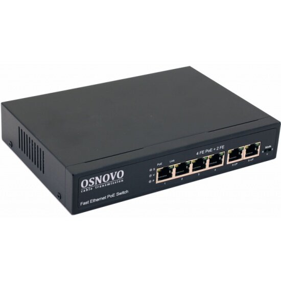 OSNOVO PoE коммутатор 6 портов, 4 PoE порта 10/100 Base-T, 2*10/100 Base-T Uplink, до 30W на порт, суммарно до 80W