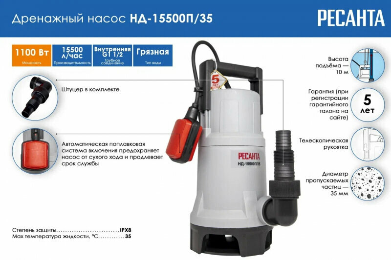 Насос / Дренажный насос НД-15500П/35 Ресанта (1100 Вт, макс. напор – 10 м, 15500 л/час, для грязной воды, диаметр пропускаемых частиц – 35 мм, 1.5“)