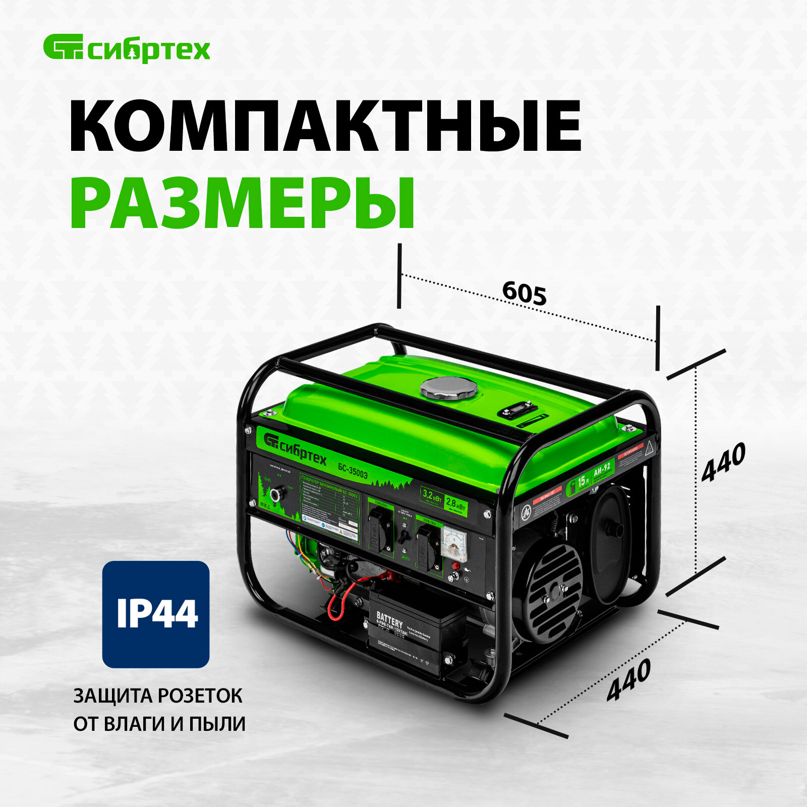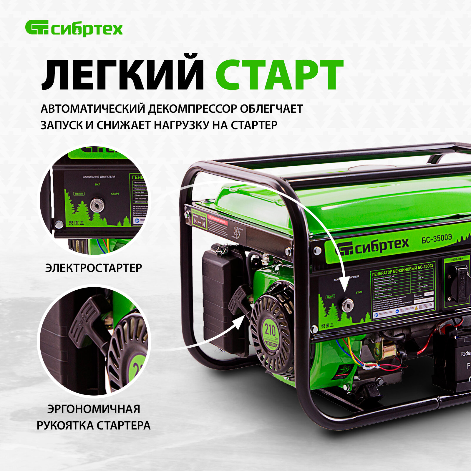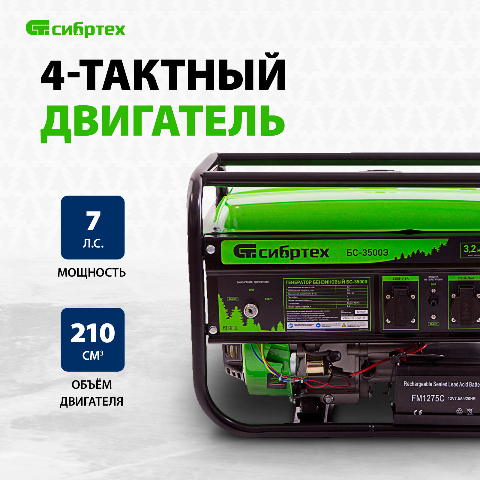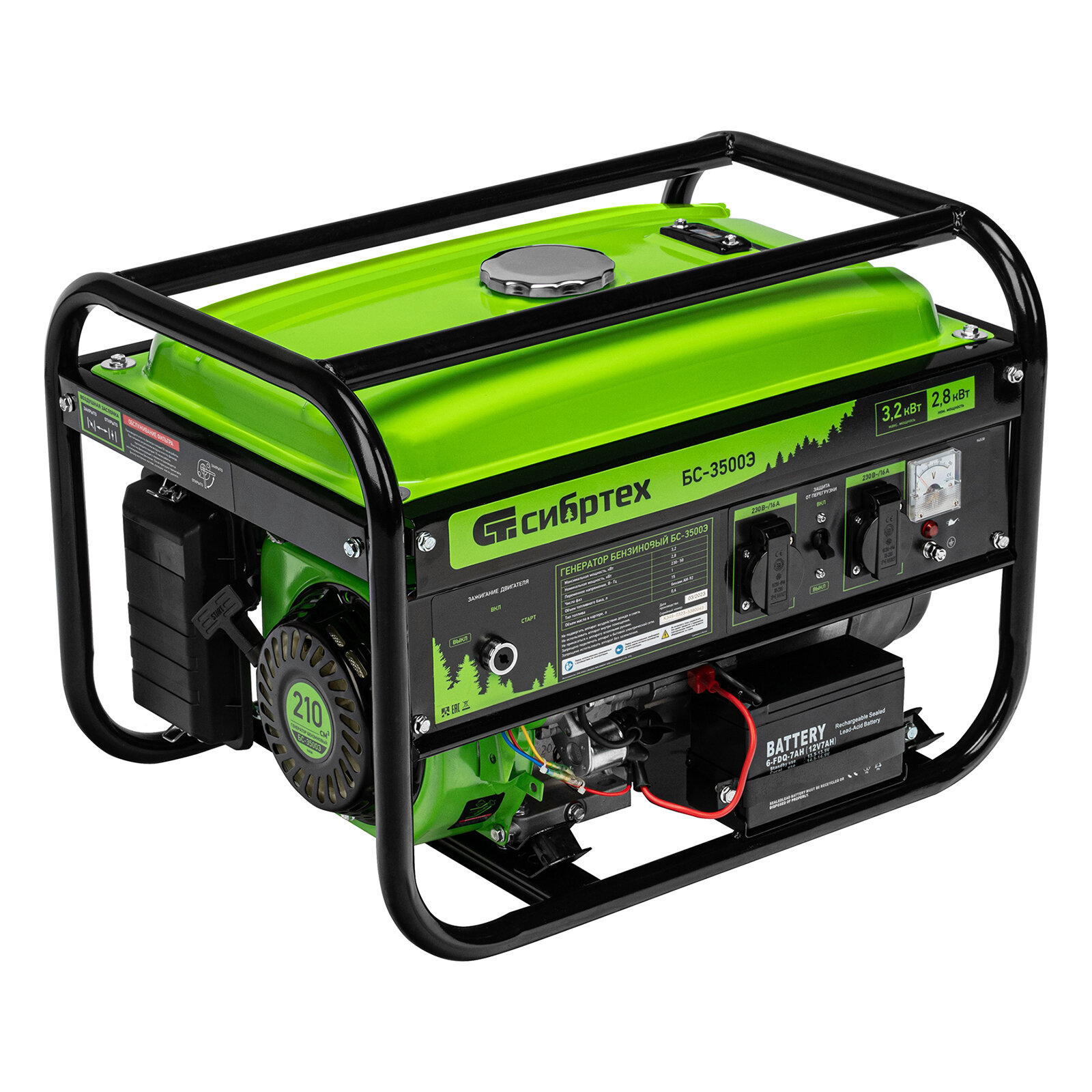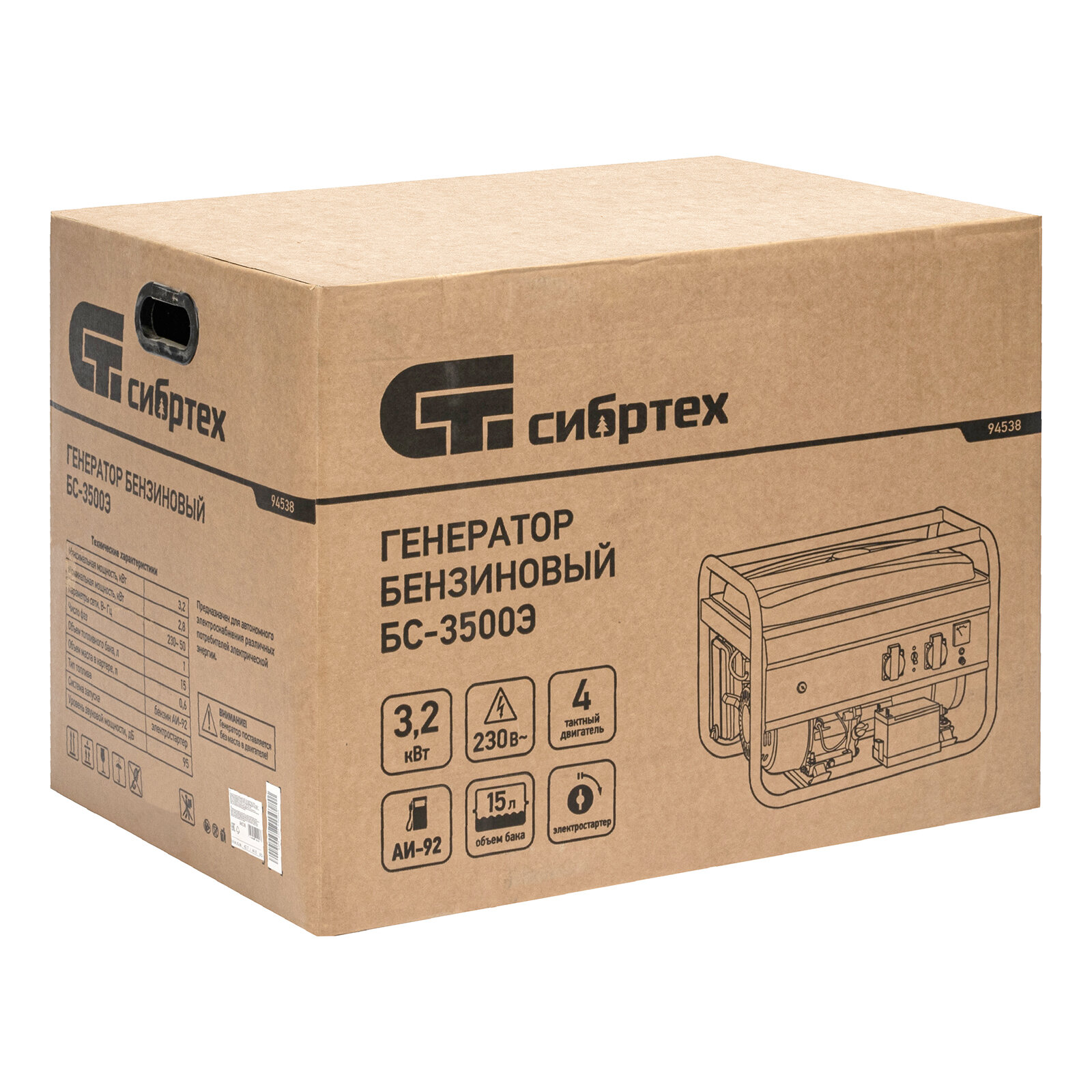 Бензиновый Генератор СИБРТЕХ БС-3500Э, 3.2 кВт, 230В, 15 л, электростартер,