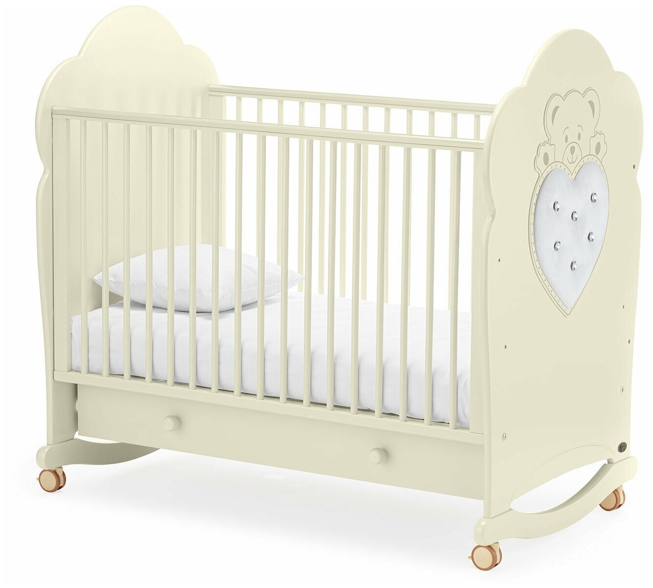 | Плюсы: | можно передвигать на колесиках. Красиво выглядит, оригинальный дизайн. Есть ящичек для вещей. Все контуры кроватки плавные, без выступающих деталей и острых углов. |