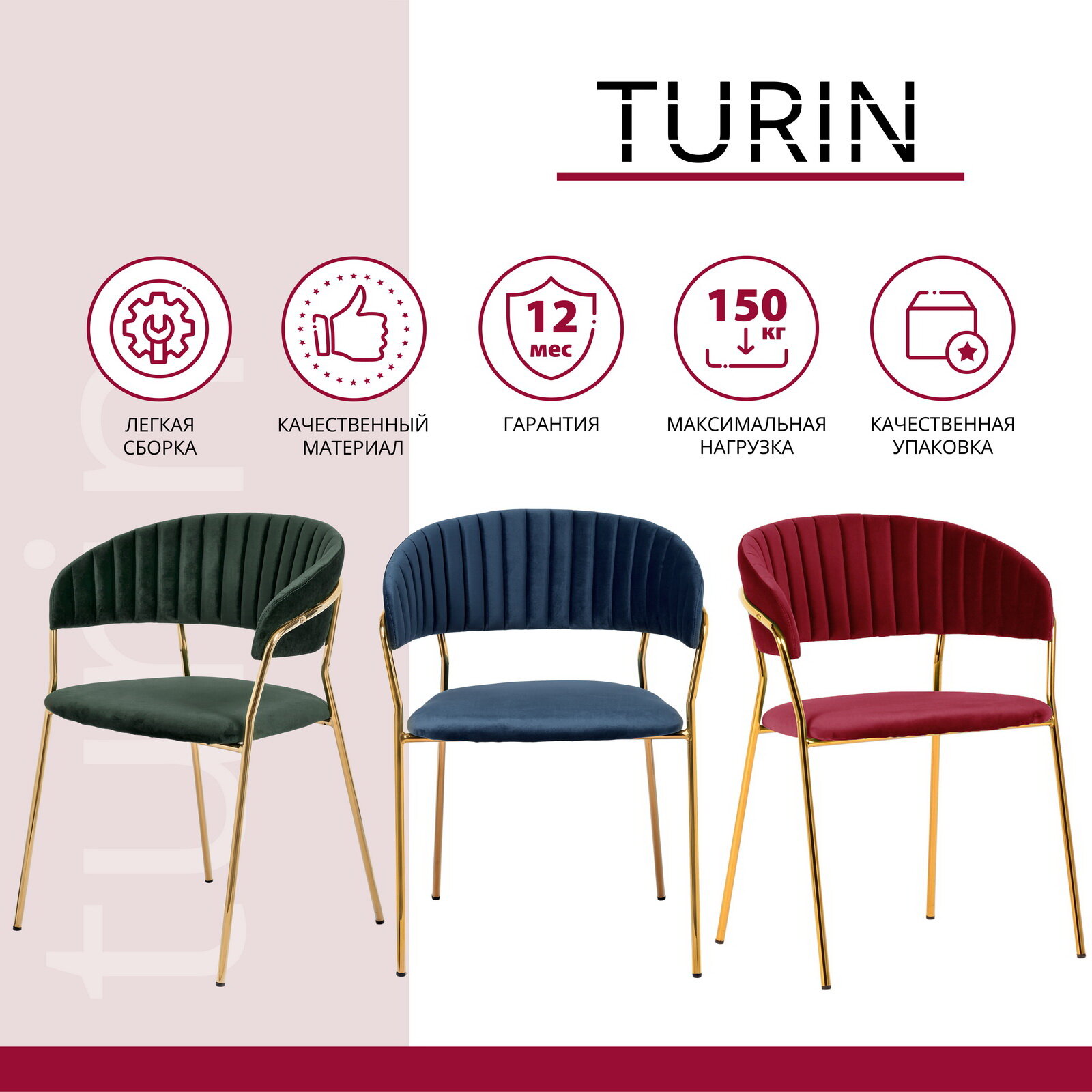 Стул Turin винный с золотыми ножками