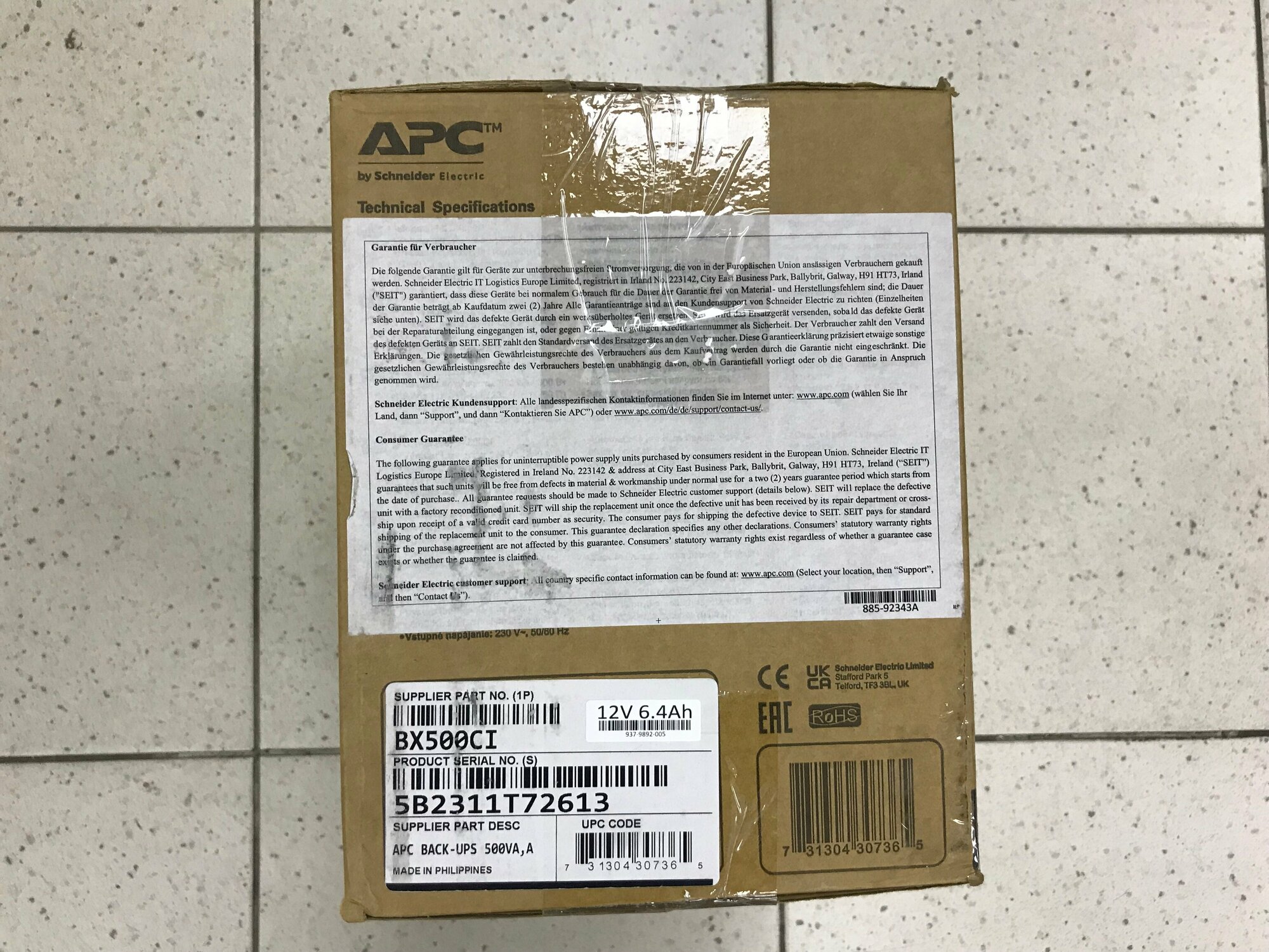 - Официальное название используемой батареи RBC114; по факту там установлена обычная CSB UPS 12240 6 F2, без единой наклейки APC. Её отличие от стандартных батарей для UPS - ширина 53мм вместо 65мм. Стандартные батареи умельцы ставят в этот ИБП с помощью кусачек и плоскогубцев. - Страница устройства на сайте производителя: https://www.apc.com/products/resource/include/techspec_index.cfm?base_sku=BX500CI&tab=models&page_type=print (из которой можно узнать его part number: BX500CI). |