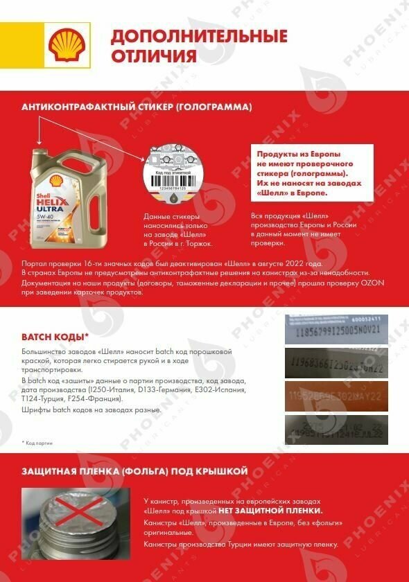 | Дополнительная информация | Компания SHELL в мае 2022 года продала весь свой бизнес компании Лукойл. Начиная с указанной даты SHELL перестал поддерживать систему проверки подлинности. Этот факт подтверждается если перейти на сайт проверки, указанный на проверочной этикетке - http://ac.shell.com/index.aspx |