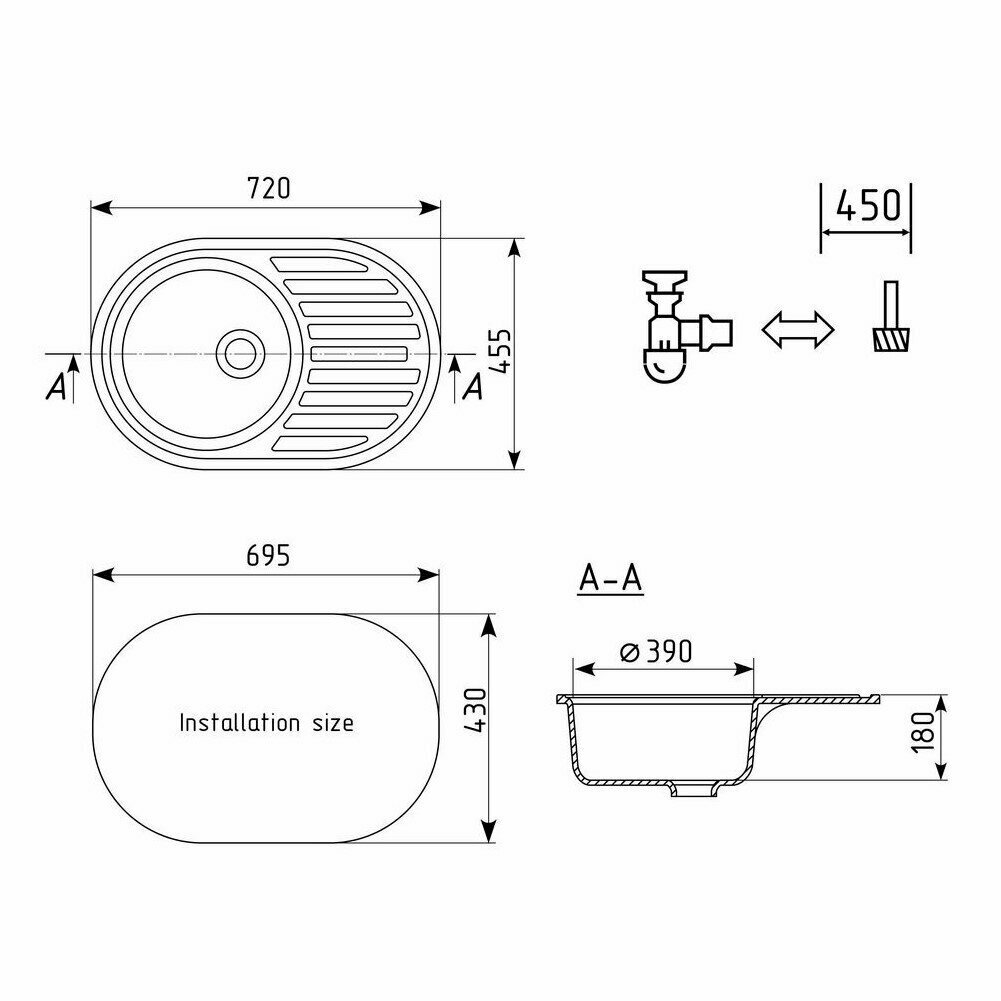 Мойка Ulgran, мрамор, U-107-308, (720*455*180 мм), черный, сифон и сливная арматура