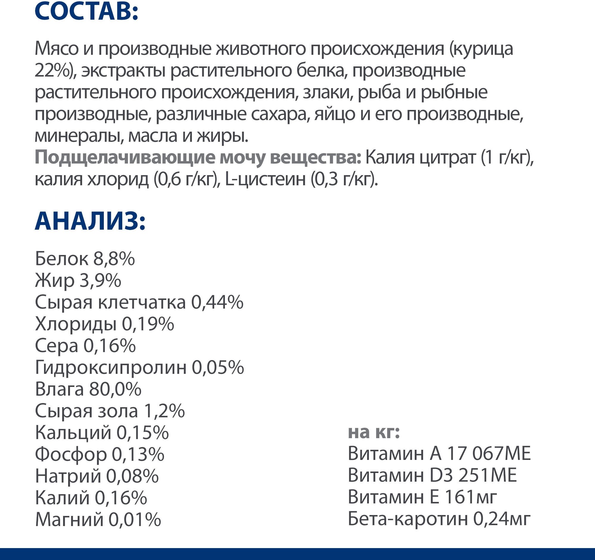 | Состав | мясо и производные животного происхождения, злаки, экстракты растительного белка, рыба и рыбные производные, различные сахара, производные растительного происхождения, яйцо и его производные, минералы, масла и жиры. Подкисляющие мочу вещества: DL-метионин, сульфат кальция, хлорид холина, калия хлорид |