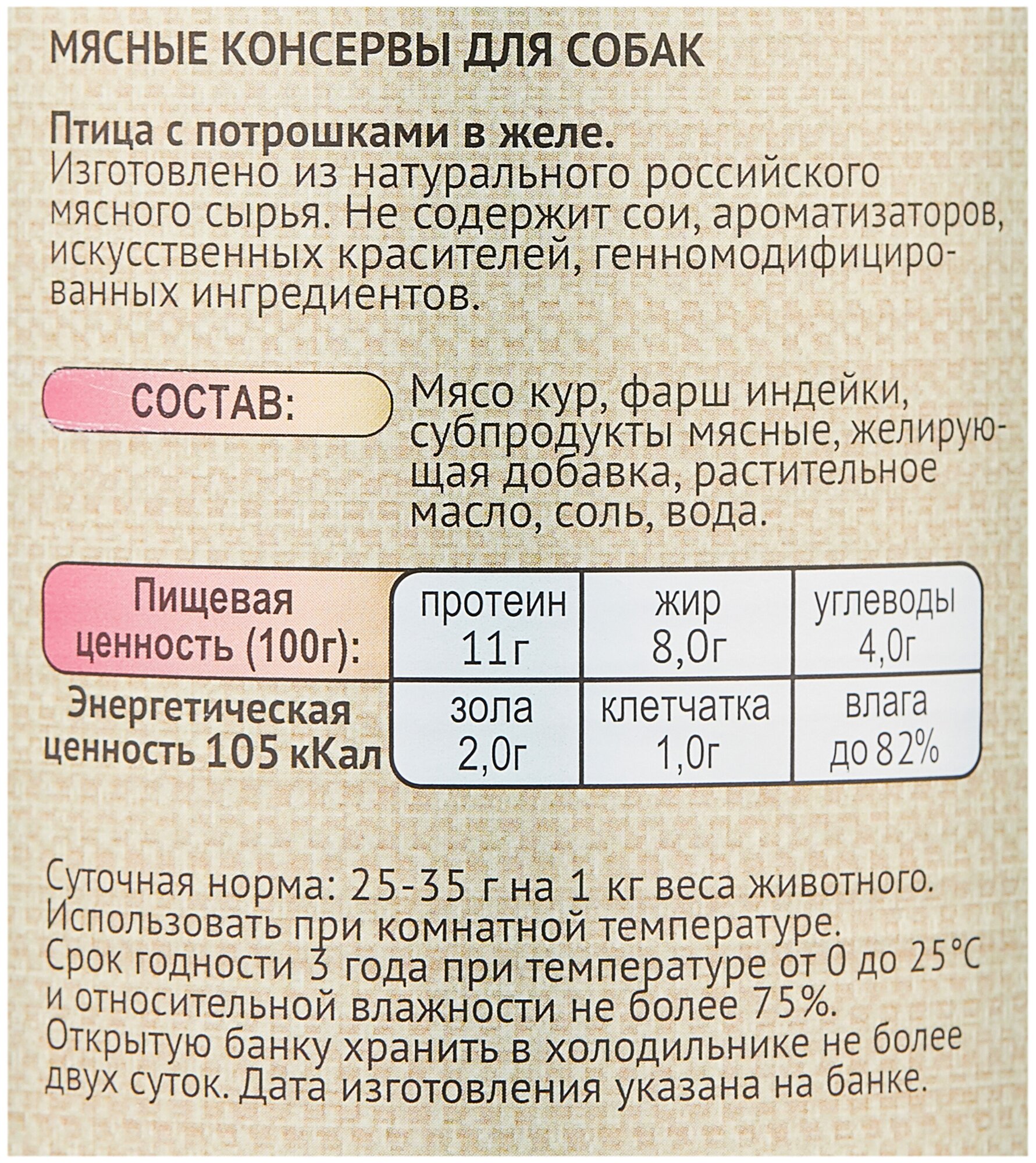 | Состав | мясо кур, фарш индейки, субпродукты мясные, желирующая добавка, растительное масло, соль, вода |