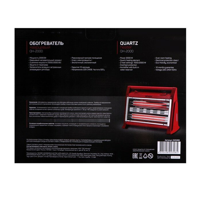 Обогреватель кварцевый Engy QH-2000, 1000/2000 Вт, напольный/настольный, до 20 м²