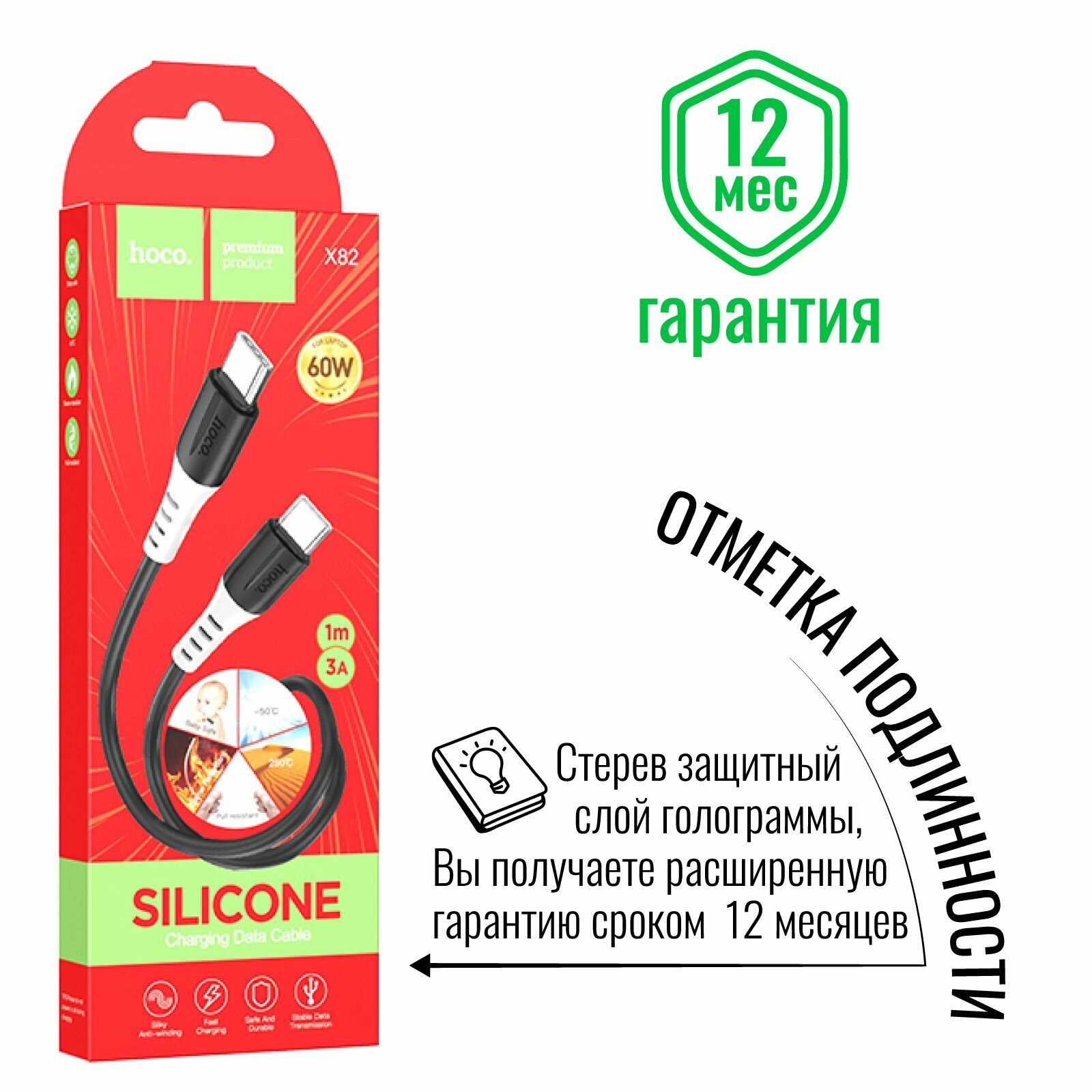 Кабель USB Type C, быстрая зарядка 60W, 1 метр, силиконовый, передача данных / провод тип с для смартфона, шнур для телефона / Hoco. X82