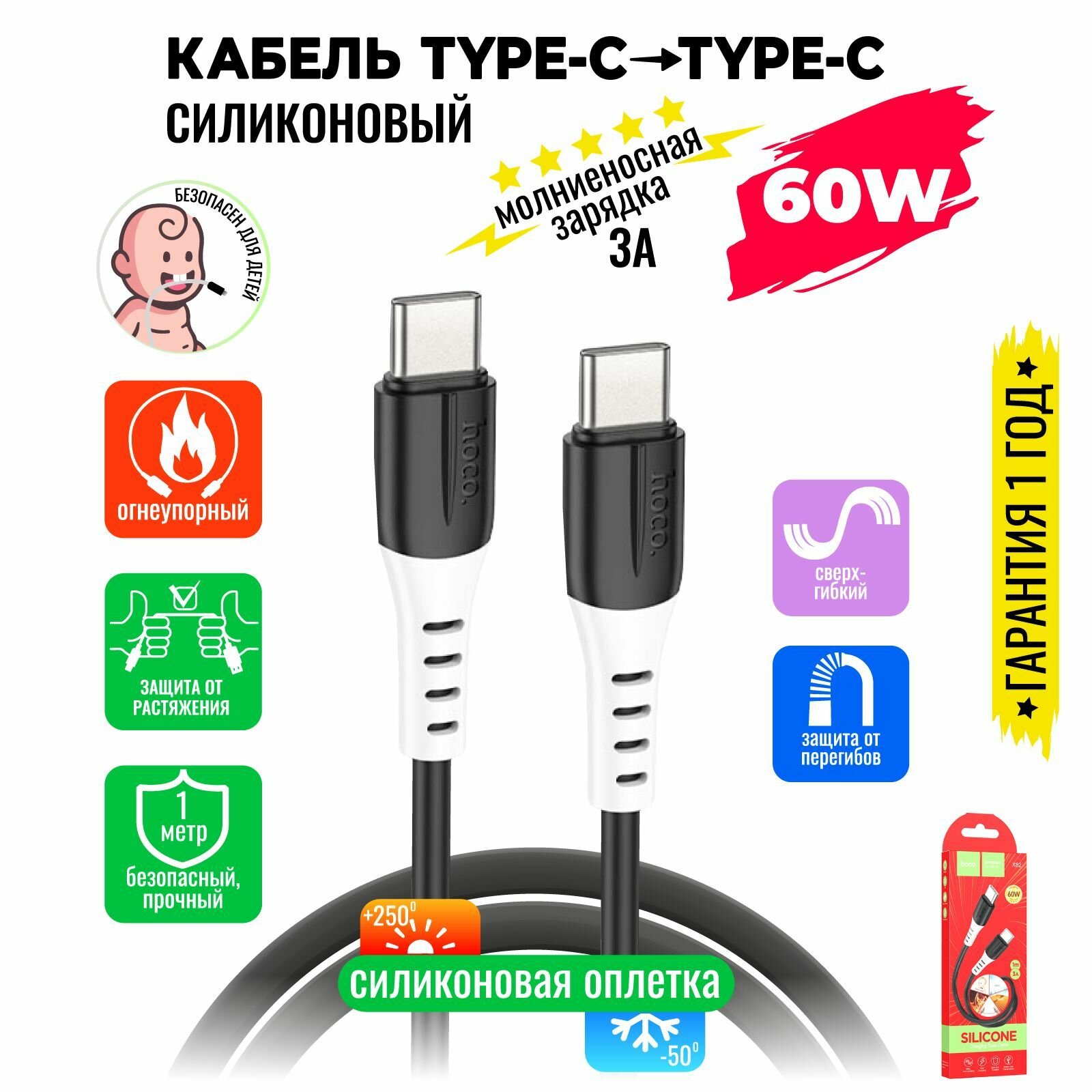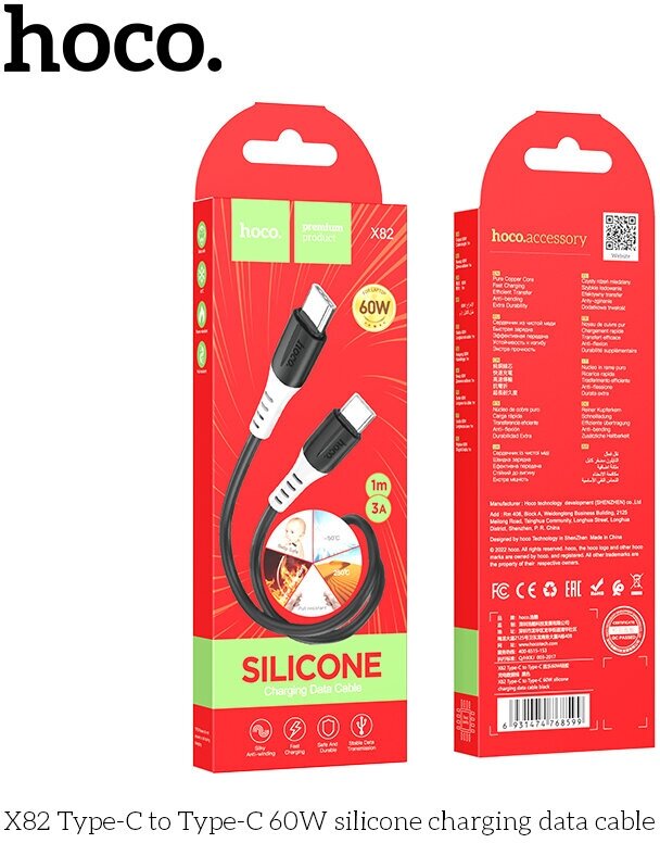 Кабель Type-C на Type-C, HOCO, X82, силиконовый, 1м, 60W, черный