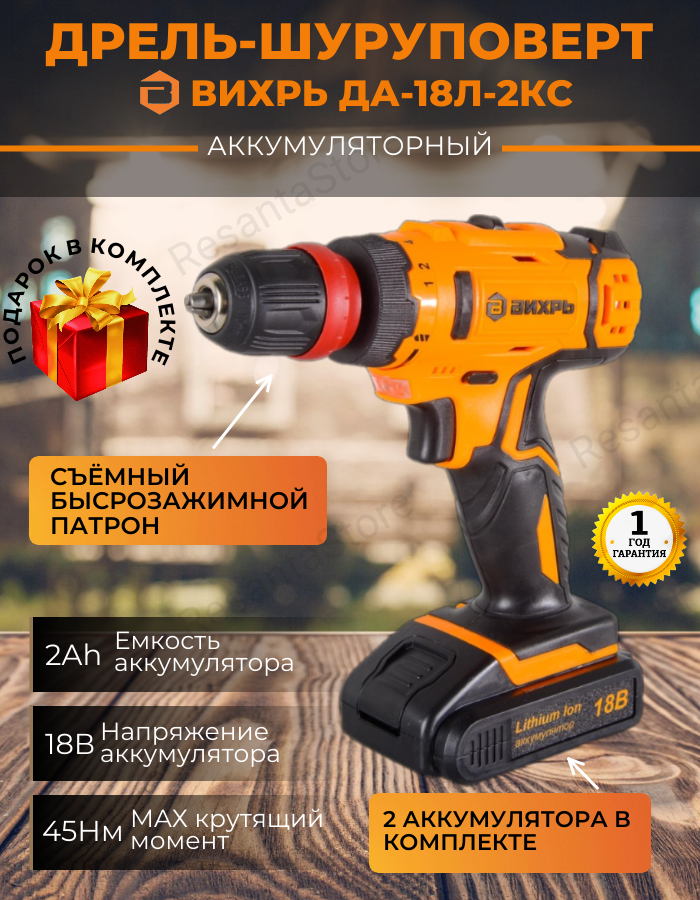 СохранитьДрель-шуруповерт аккумуляторная Вихрь ДА-18Л-2КC (2,0 А/ч), 72/14/34 интересное: