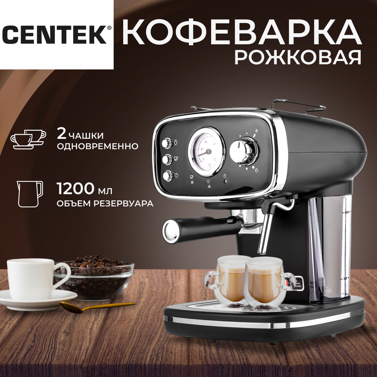 Кофемашина / Centek CT-1165 RETRO STYLE / Кофеварка рожковая / 15 бар / Отсек для воды 1,2 л / Аналоговый индикатор температуры