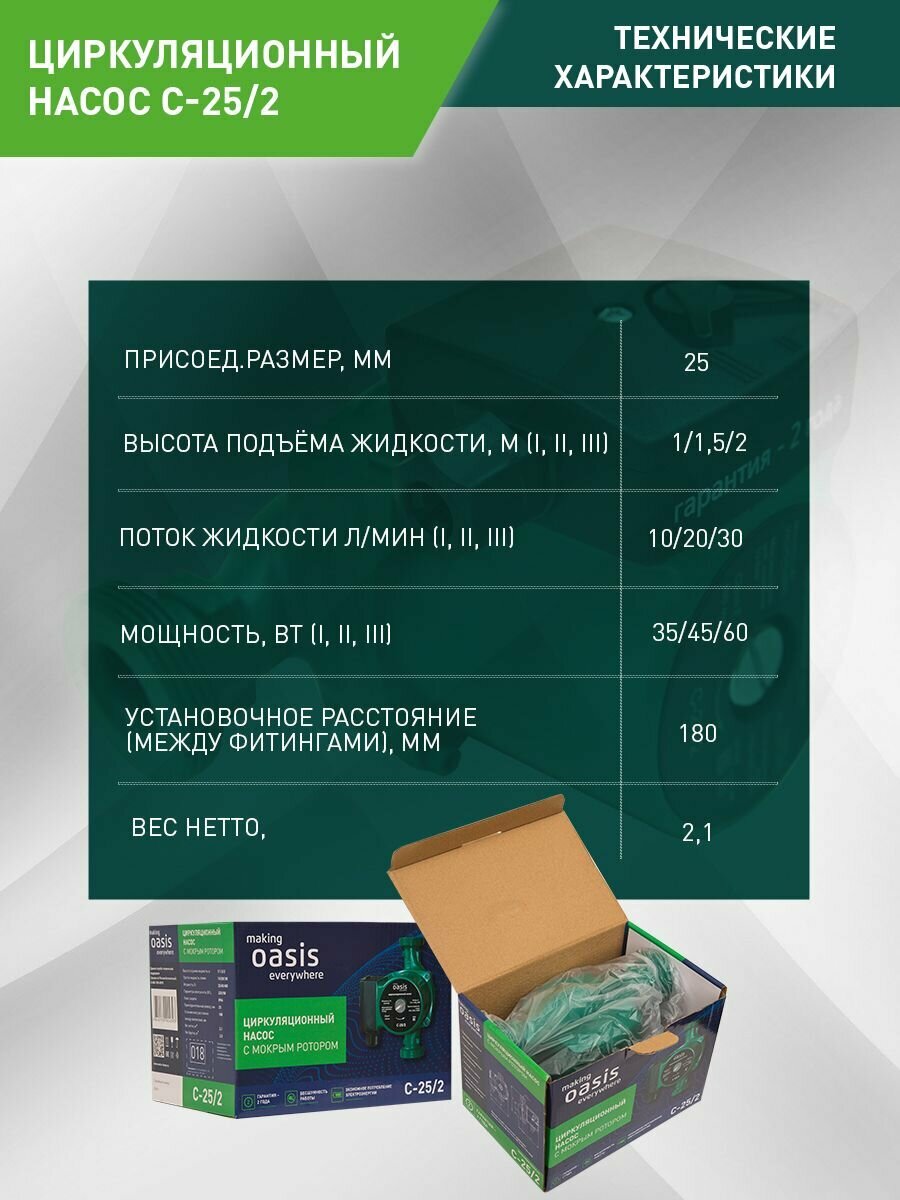 Насос циркуляционный для отопления making Oasis everywhere C-25/2, 60 Вт, напор 2 м, 30 л/мин