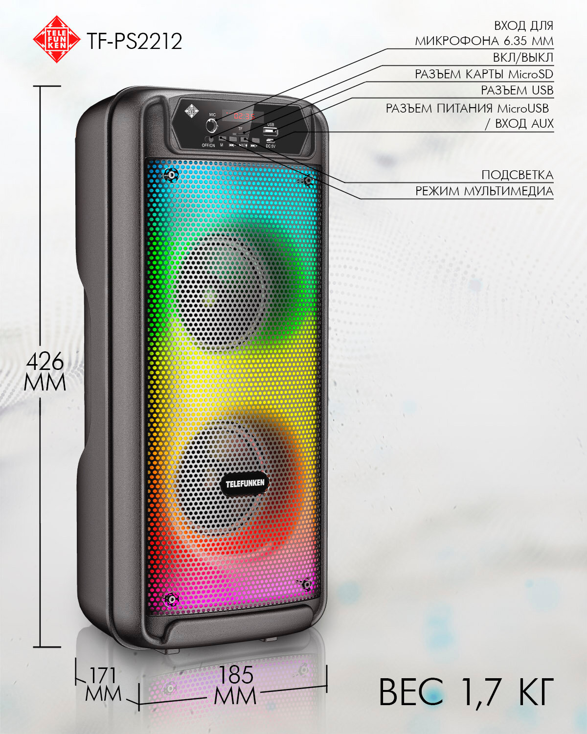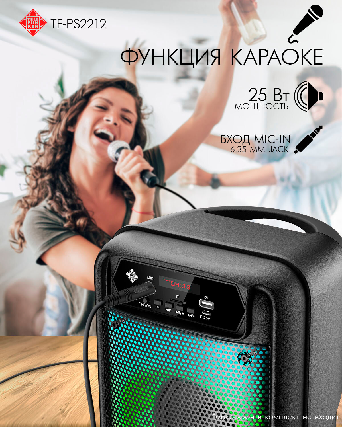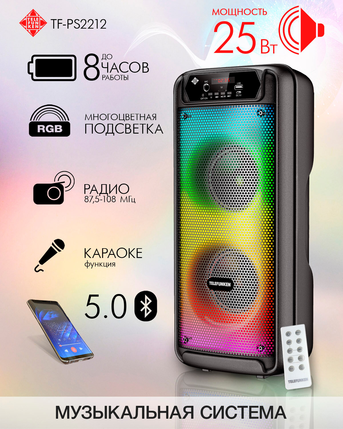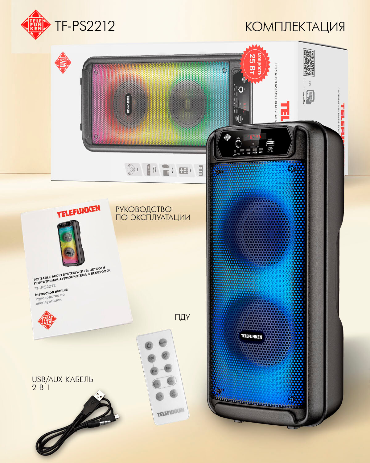 TELEFUNKEN Портативная колонка Telefunken TF-PS2212, 25 Вт, 1800мАч, FM, BT, microSD, USB, подсветка
