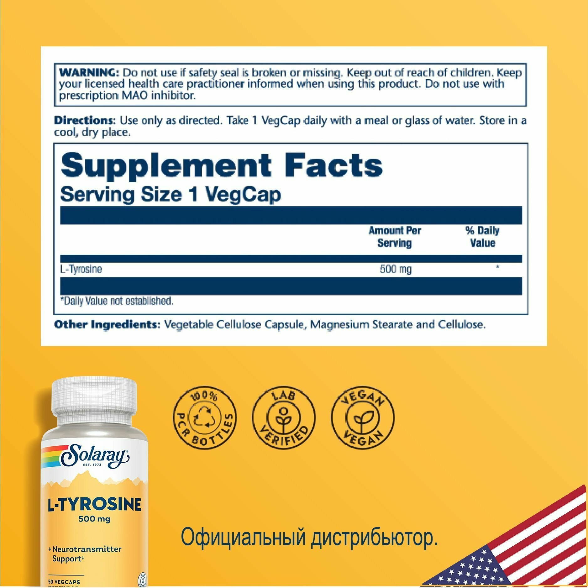 Solaray L-Tyrosine (L-тирозин) 500 мг 50 вег капсул
