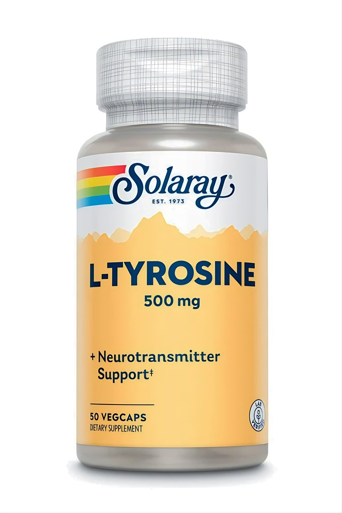Купить L-Тирозин Solaray 500мг, 50 капсул, для настроения, мозга, похудения, щитовидной железы