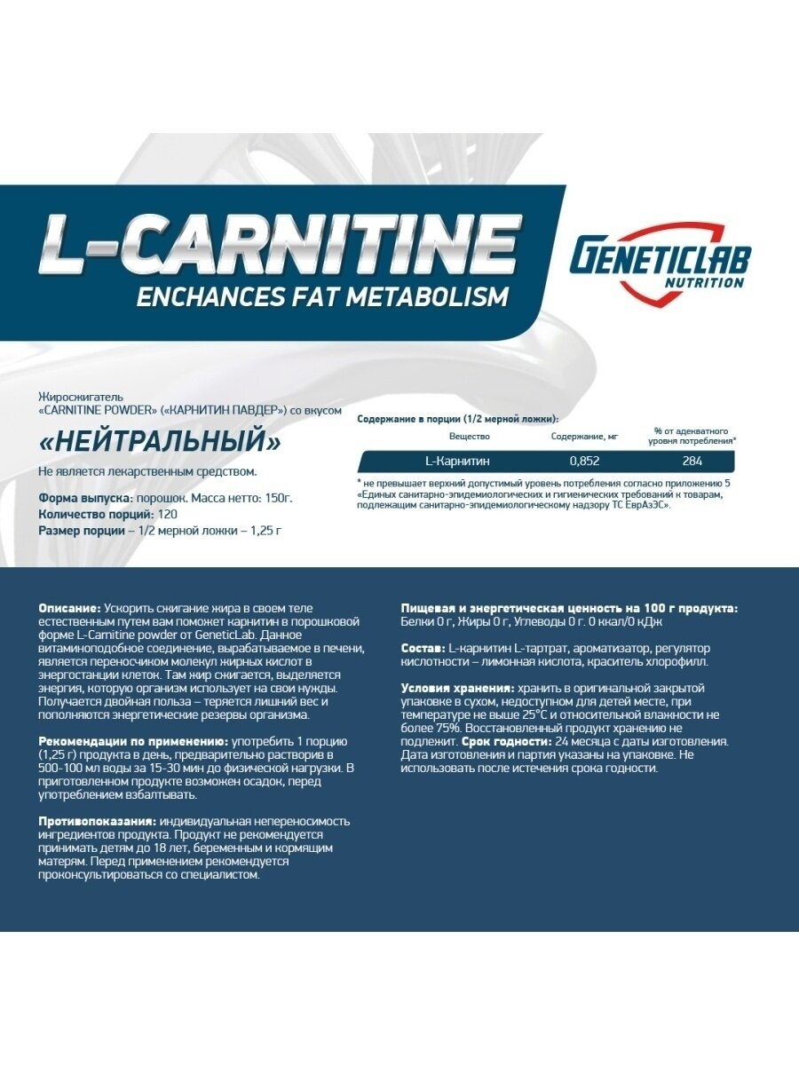 | Дополнительная информация | состав: L-карнитин L-тартрат; рекомендации по применению: Рекомендации по применению: Рекомендуется для питания спортсменов в дополнение к основному рациону как дополнительный источник L-карнитина. Способ применения: Употребить 1 порцию (1,25 г) продукта в день, предварительно растворив в 50-100 мл воды за 15-30 мин до физической нагрузки. Дозировка может быть увеличена по рекомендации тренера, либо врача. Адекватная рабочая дозировка 2700 мг |