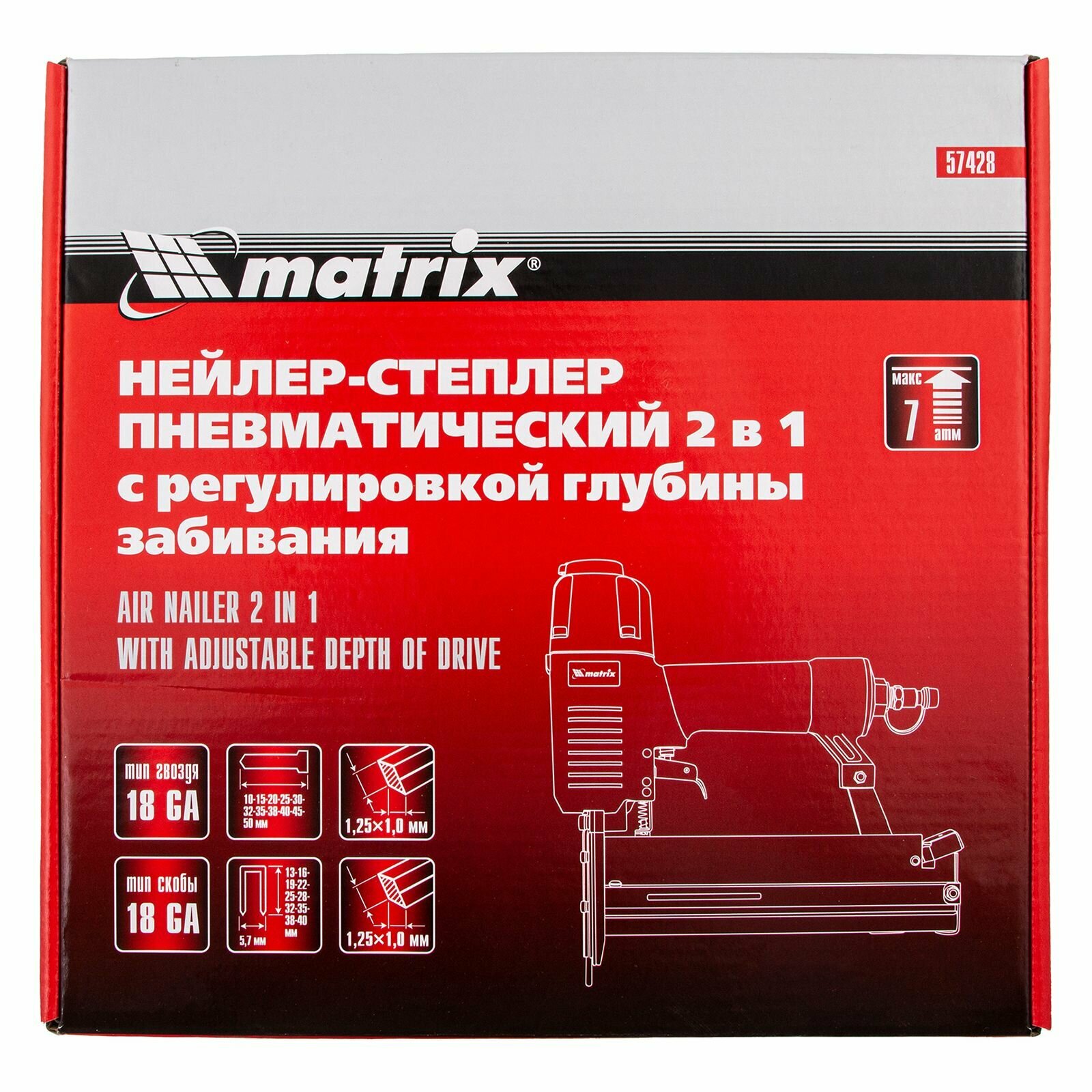Пистолет пневматический MATRIX 57428, 2 в 1, с регулировкой глубины, гвозди 18GA, скобы 18GA