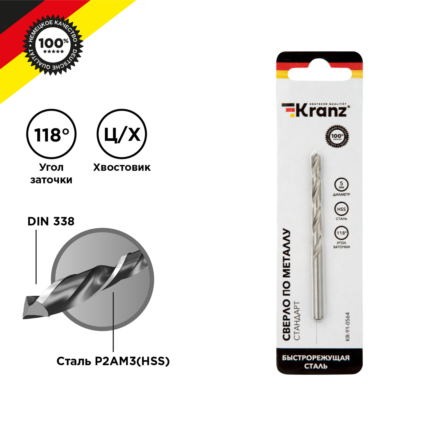 Сверло KRANZ по металлу 5,0 мм повышенной прочности с углом заточки 118 градусов HSS, 1 шт. в упаковке, DIN 338 интересное: