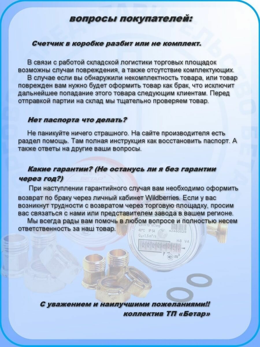 | Отзыв: | на вид счетчик нормальный,новый, с паспортом и прокладки в комплекте,на коробке надпись без монтажного комплекта,на фото и в описании этого нет,поэтому возврат. |