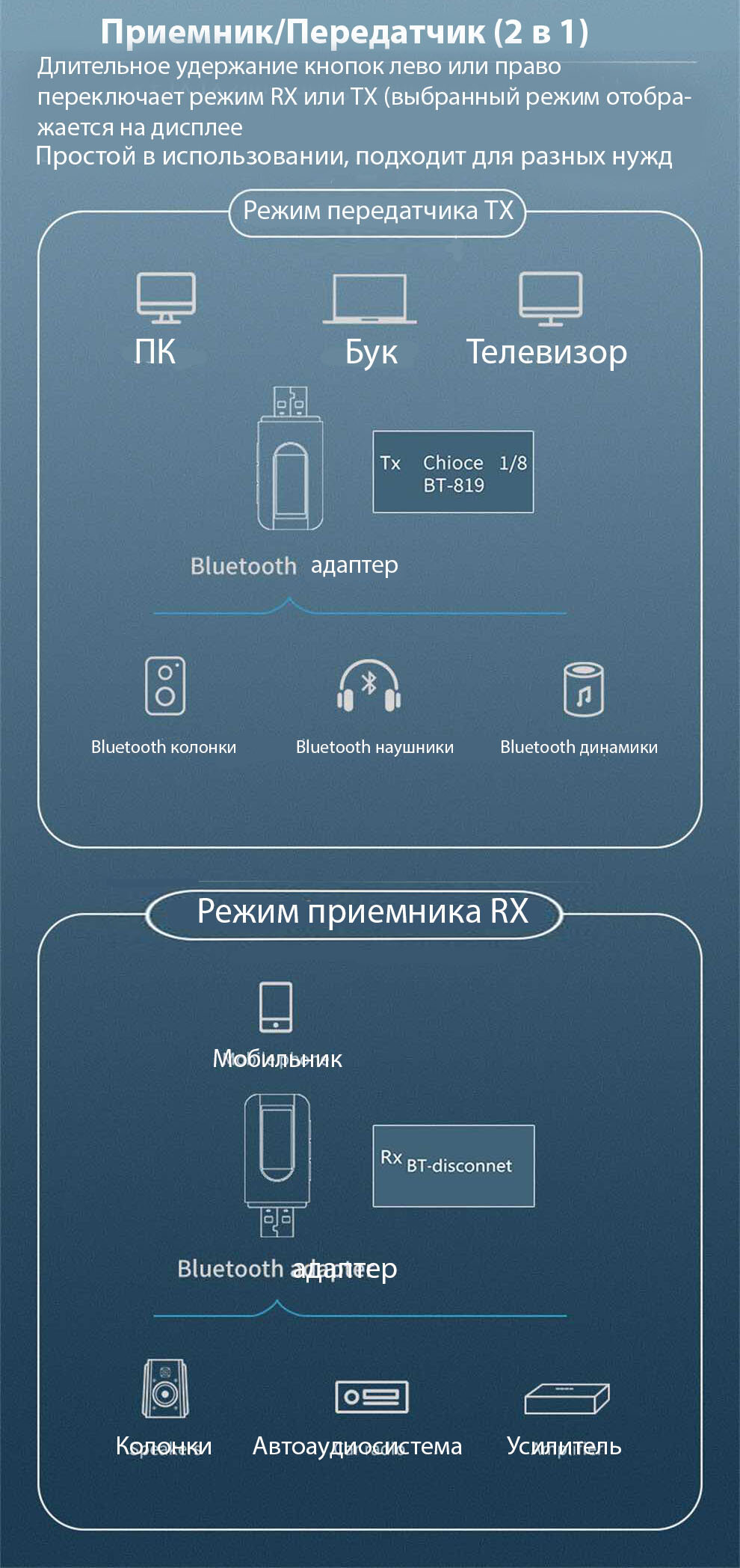 Bluetooth 5.0 адаптер с ЖК дисплеем (два в одном) BT-819. интересное:
