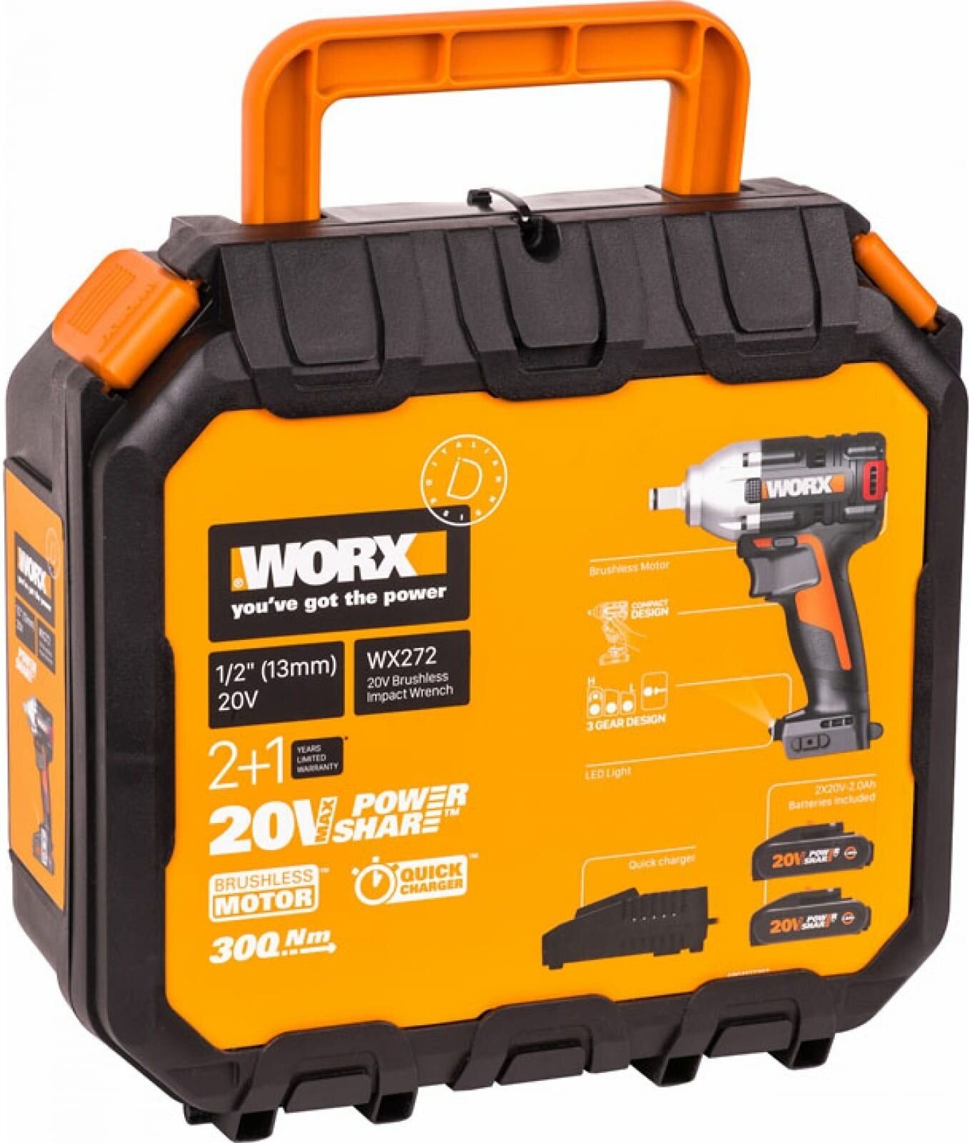 WORX Гайковерт аккумуляторный 20В бесщеточный 2Ач x2 кейс WX272