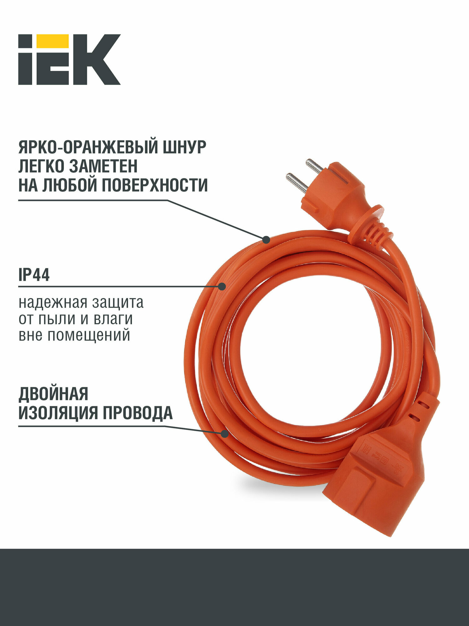 Удлинитель-шнур IEK УШ-01РВ, с вилкой и розеткой, 3 x 1 мм², 5 м, оранжевый