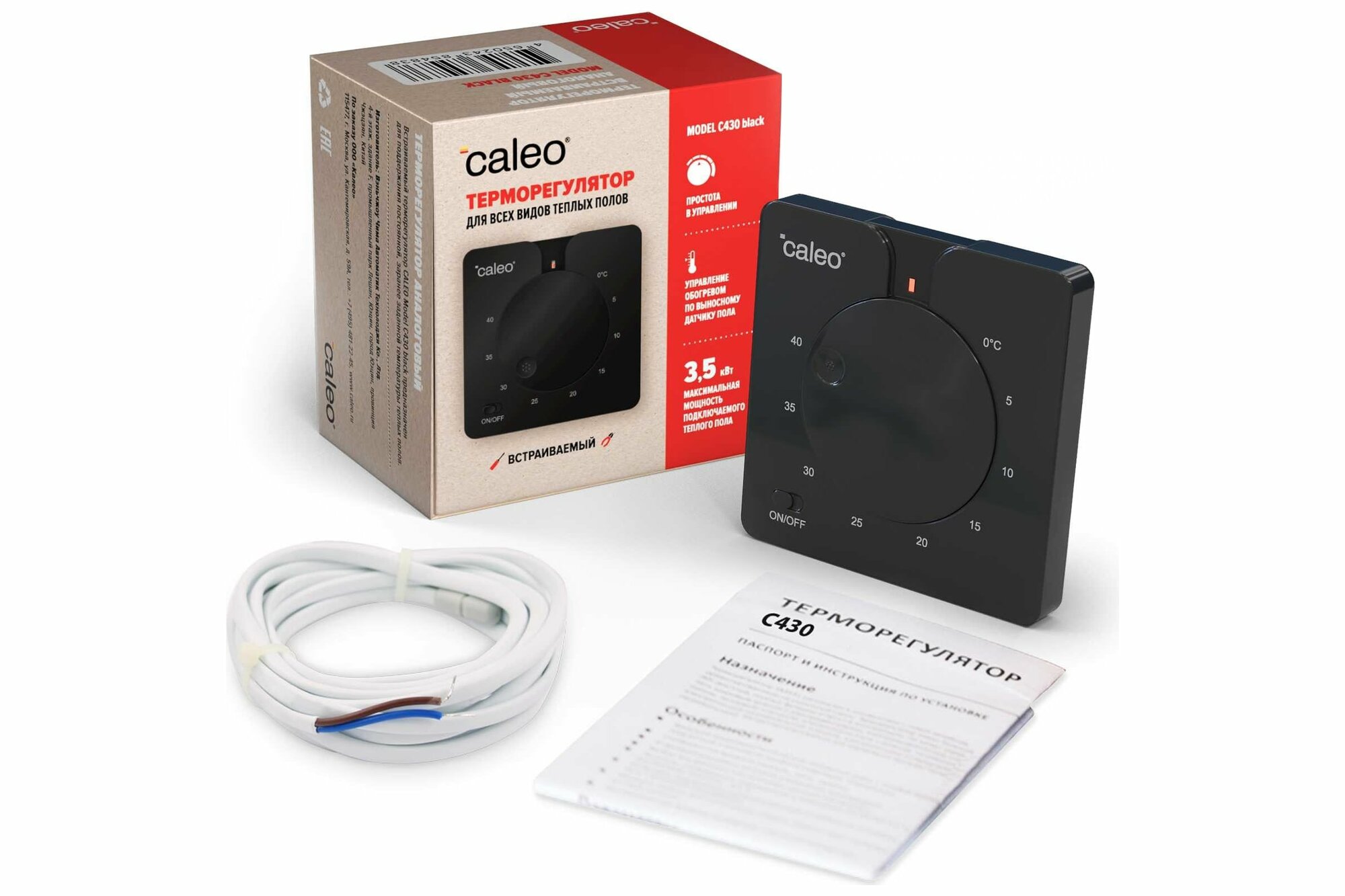 Терморегулятор Caleo C430, встраиваемый, аналоговый, 3.5 кВт (черный)