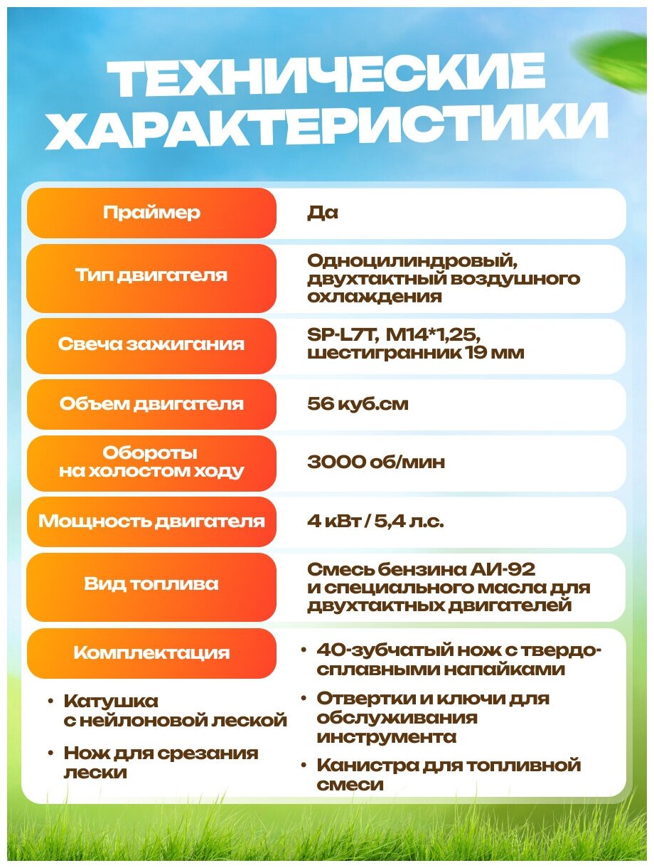| Минусы: | Свечи летят быстро, закупайте сразу с запасом. Родная экипировка очень не удобная, все время с плеч все слетает. Купили другую. Расход бензина больше, чем рассчитвали, но у нас такие заросли, что может потом и меньше будет |