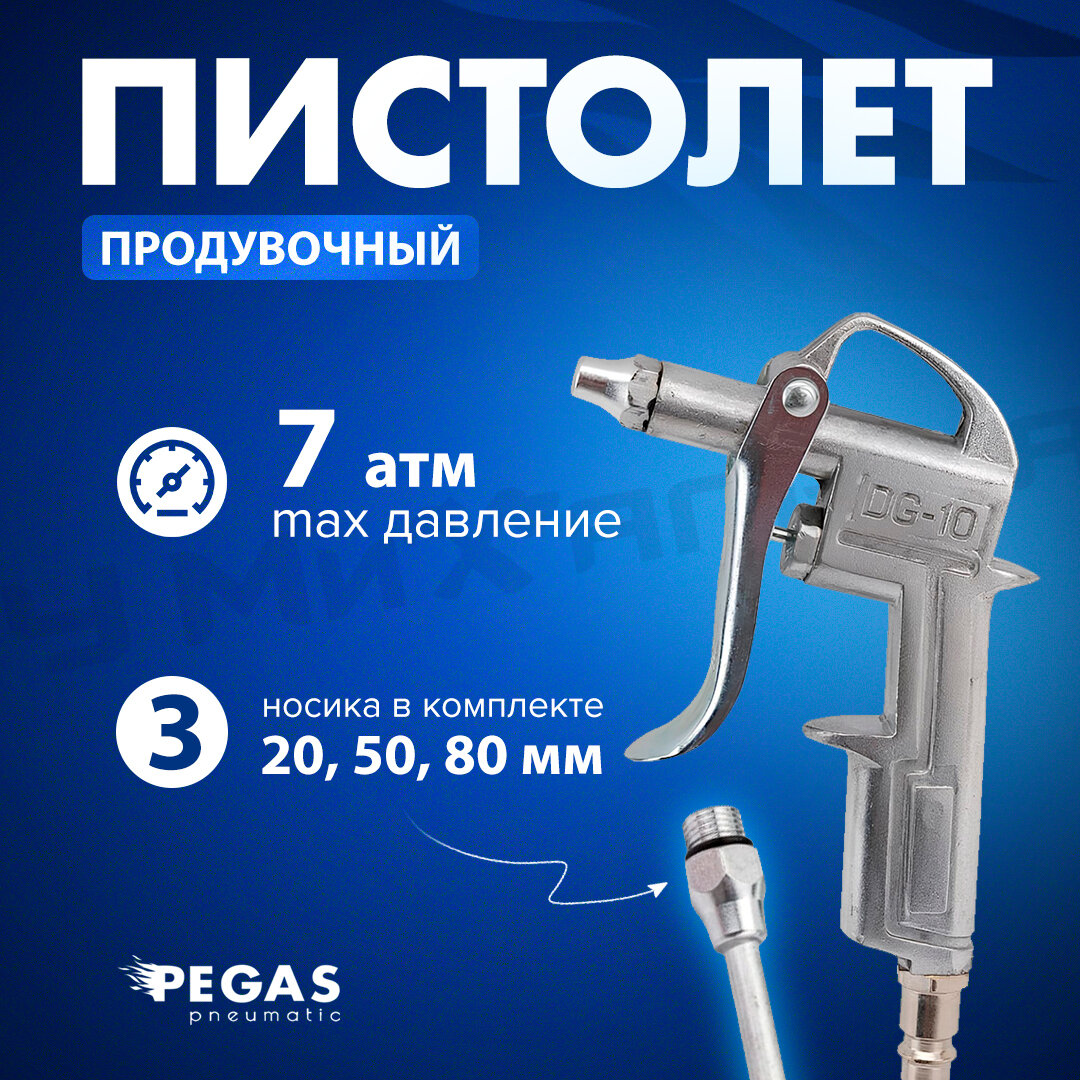 Pegas pneumatic Продувочный пистолет металлический с набором аксессуаров. Длина носика: 20мм, 50 мм,