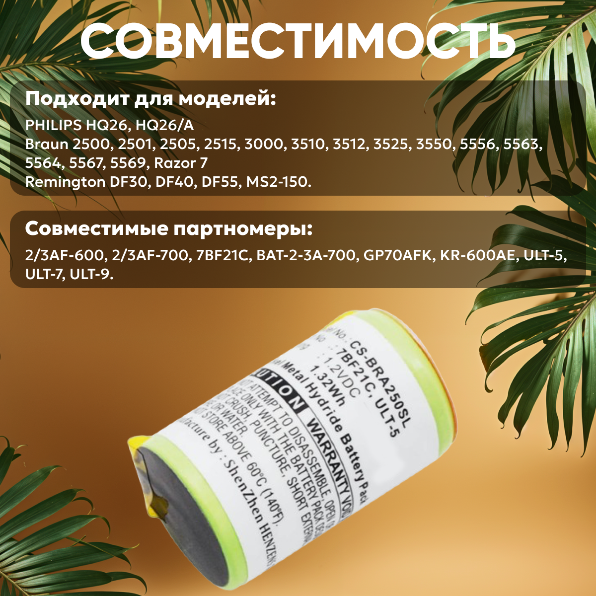 | Совместимость | Данная аккумуляторная батарея подходит для зубных щёток: PHILIPS HQ26 / HQ26/A / Braun 2500 / 2501 / 2505 / 2515 / 3000 / 3510 / 3512 / 3525 / 3550 / 5556 / 5563 / 5564 / 5567 / 5569 / Razor 7 / Remington DF30 / DF40 / DF55 / MS2-150 / MS2-200 / MS2-250 / MS2-260 / MS2-270 / MS2-300 / MS2-370 / MS2-400 / ES-1000 / MB-70 / MB-400 / WDF-5500. Партномера: 2/3AF-600 / 2/3AF-700 / 7BF21C / BAT-2-3A-700 / GP70AFK / KR-600AE / ULT-5 / ULT-7 / ULT-9 / CS-BRA250SL |