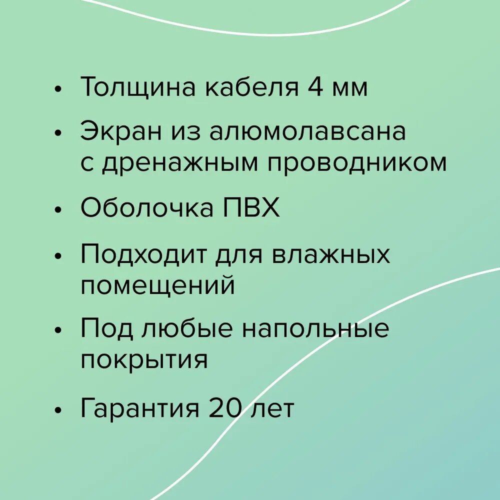 | Дополнительная информация | двойная изоляция: нагревательных жил - ТПЕЕ; внешняя - ПВХ; защитный экран - из алюминиевой фольги с дренажным проводником |