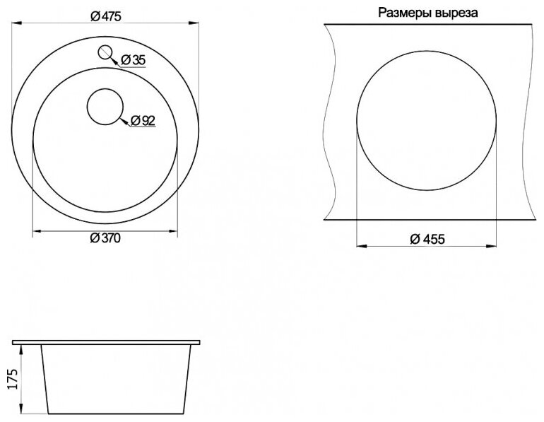 Кухонная мойка кварцевая Granula GR-4801 односекционная круглая, врезная, чаша D 370, цвет базальт (4801bt)