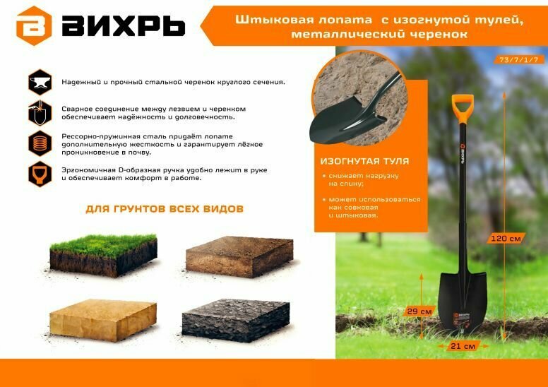 Штыковая лопата Вихрь с изогнутой тулейкой, металлический черенок (длина лопаты: 120 см, длина полотна: 29 см, ширина полотна: 21 см, стальной черенок)