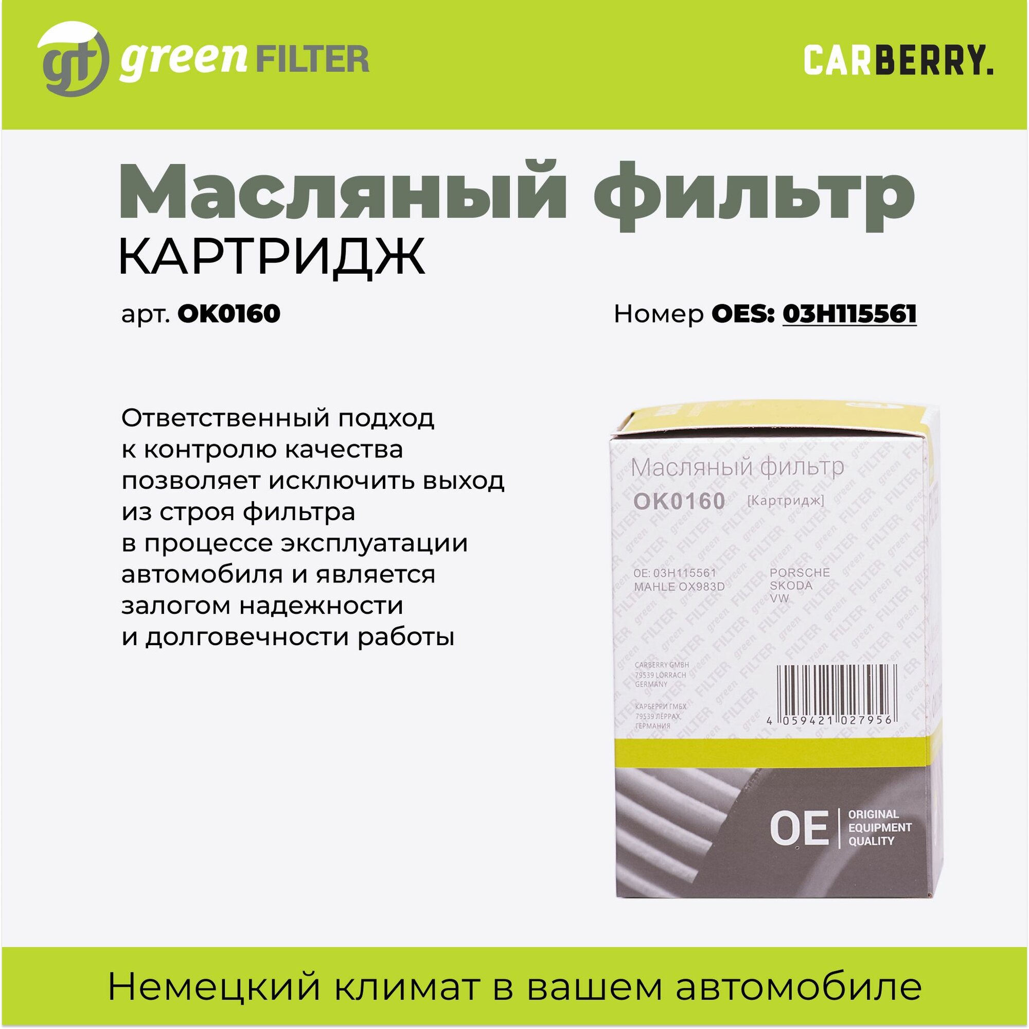 Фильтр масляный (картридж) GREEN FILTER OK0160 для PORSCHE, SKODA, Volkswagen