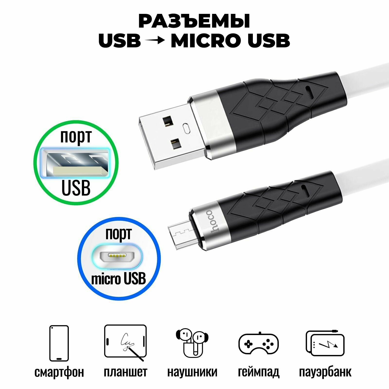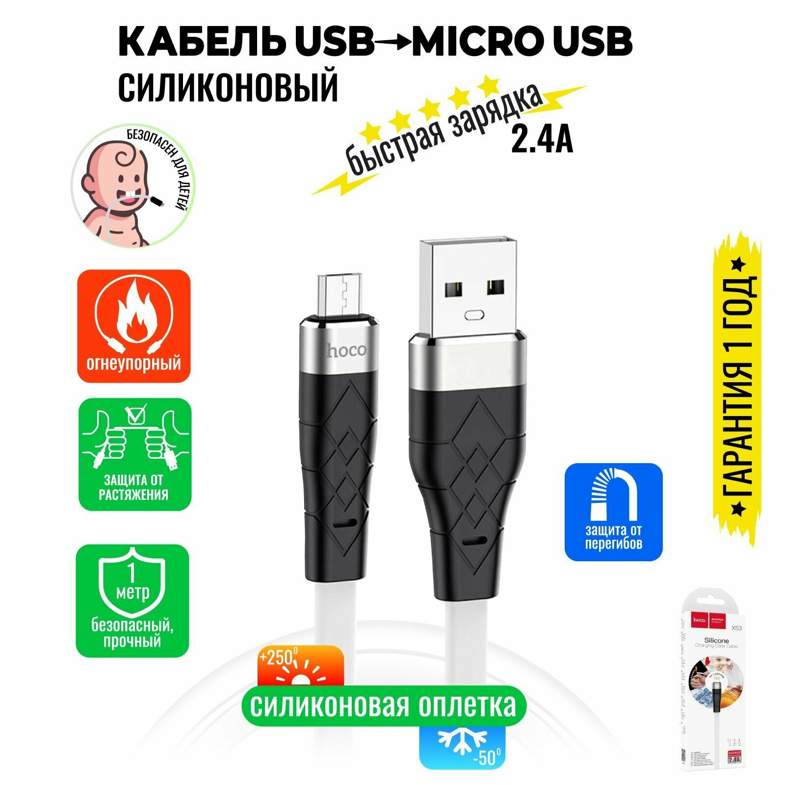 Кабель Micro USB, быстрая зарядка, 1 метр, силиконовый, передача данных / шнур для телефона микро юсб для Android / Провод для андройд / Hoco. X53