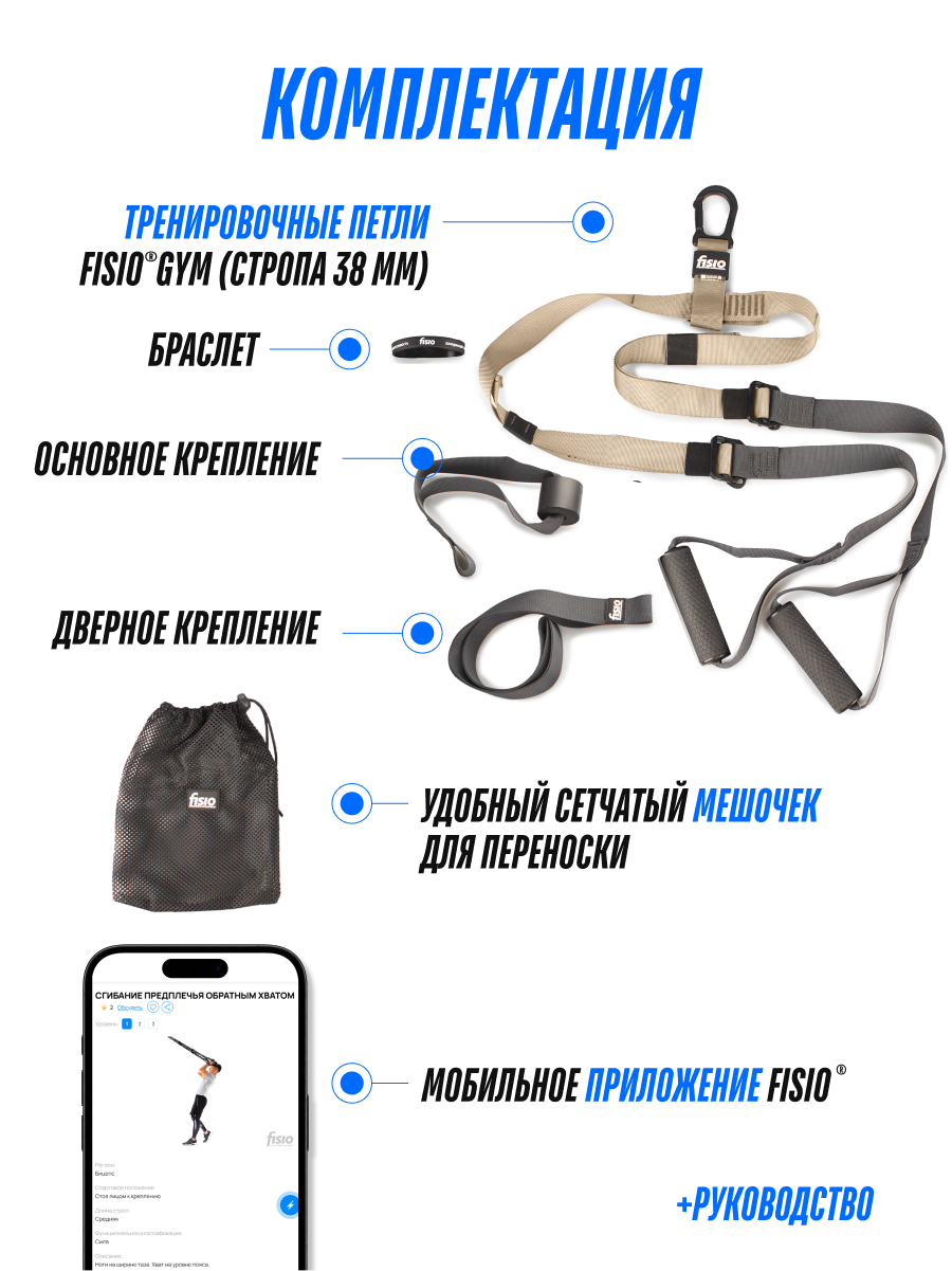 | Подробная комплектация | Тренировочные петли Физио - 1 шт; Рюкзак - 1 шт; Дверное крепление - 1 шт; Основное крепление - 1 шт; Браслет - 1 шт |