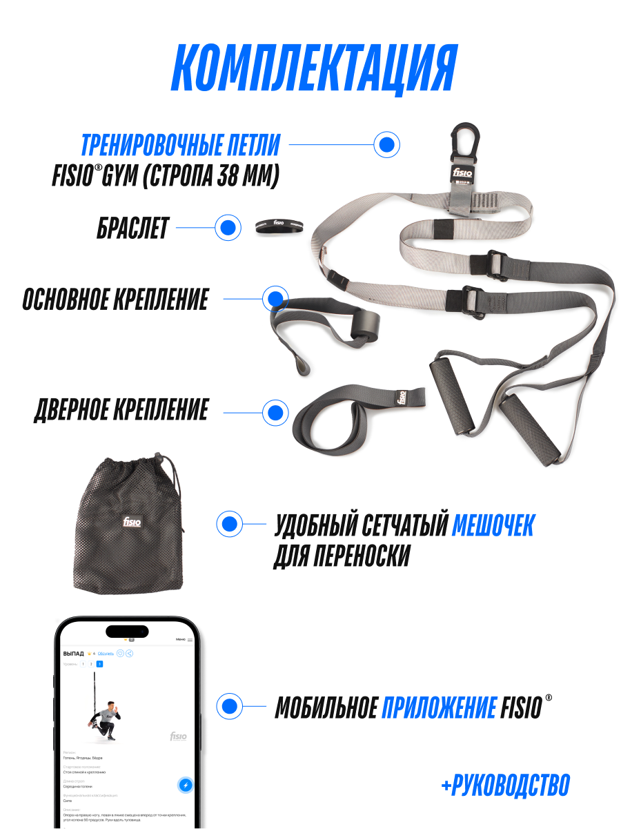 | Подробная комплектация | Тренировочные петли Физио - 1 шт; Рюкзак - 1 шт; Дверное крепление - 1 шт; Основное крепление - 1 шт; Браслет - 1 шт |