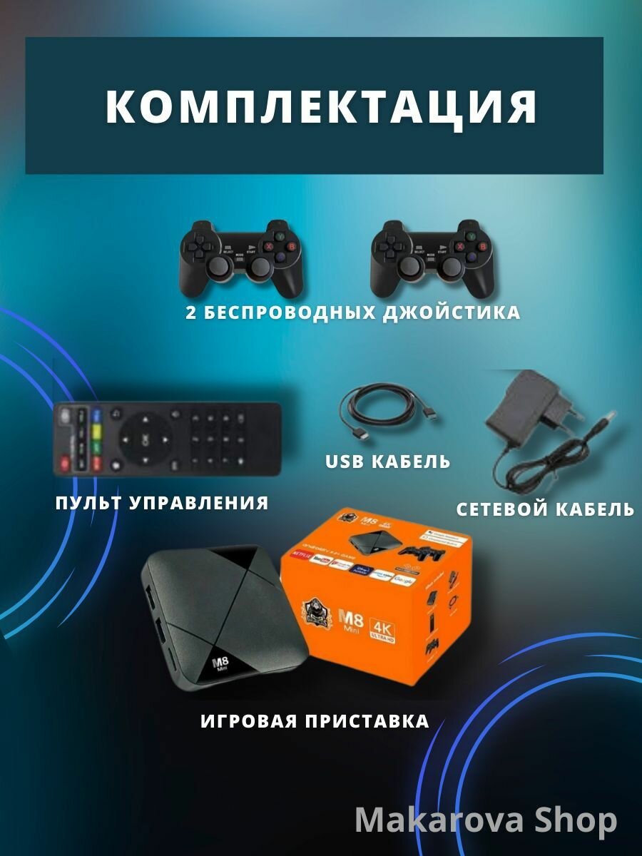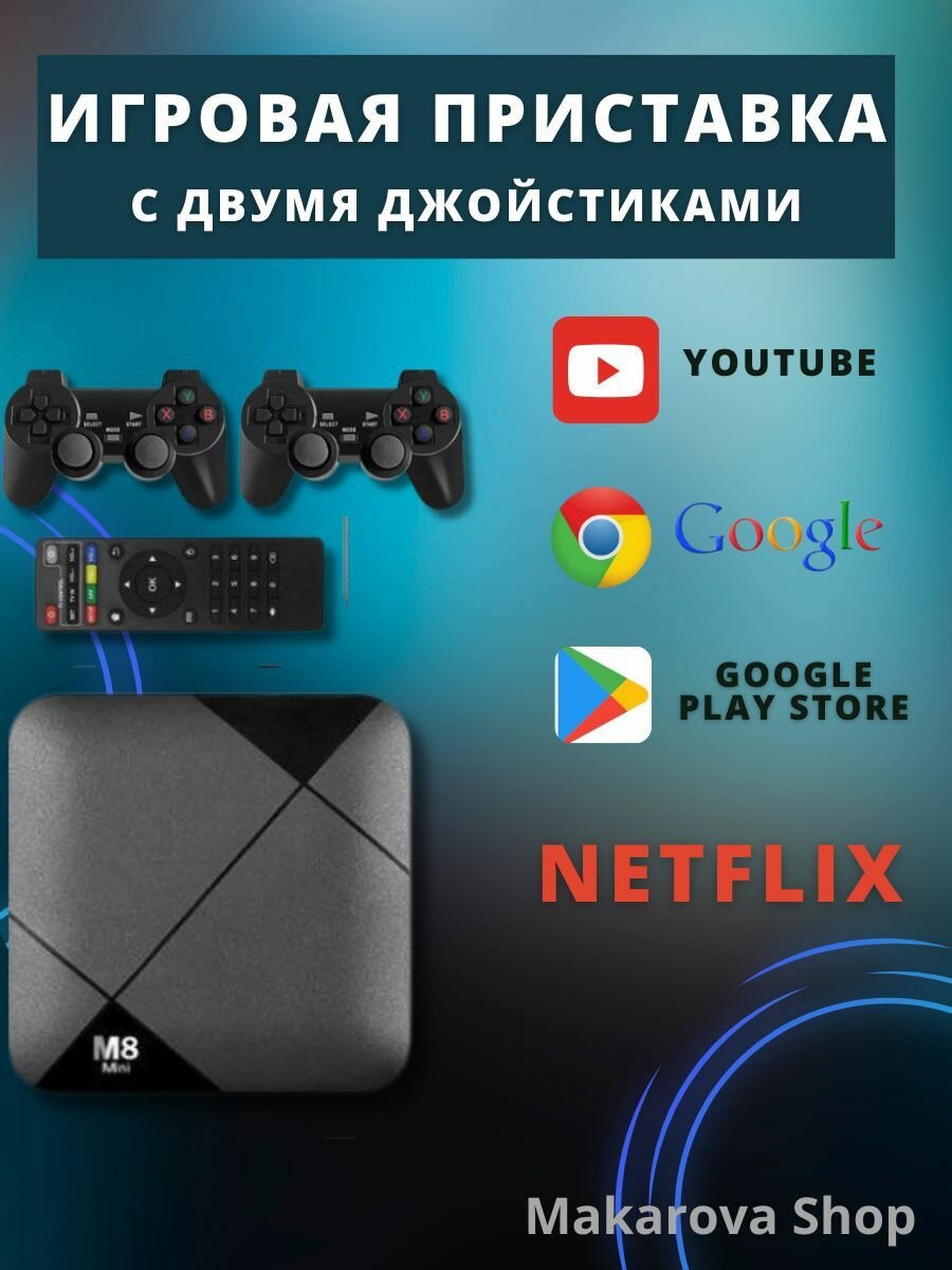 Купить Игровая приставка Game Box m8 Ultra HD + Android TV 64 GB + 10000 встроенных игр + 2 беспроводных геймпада + пульт ДУ (Черный)