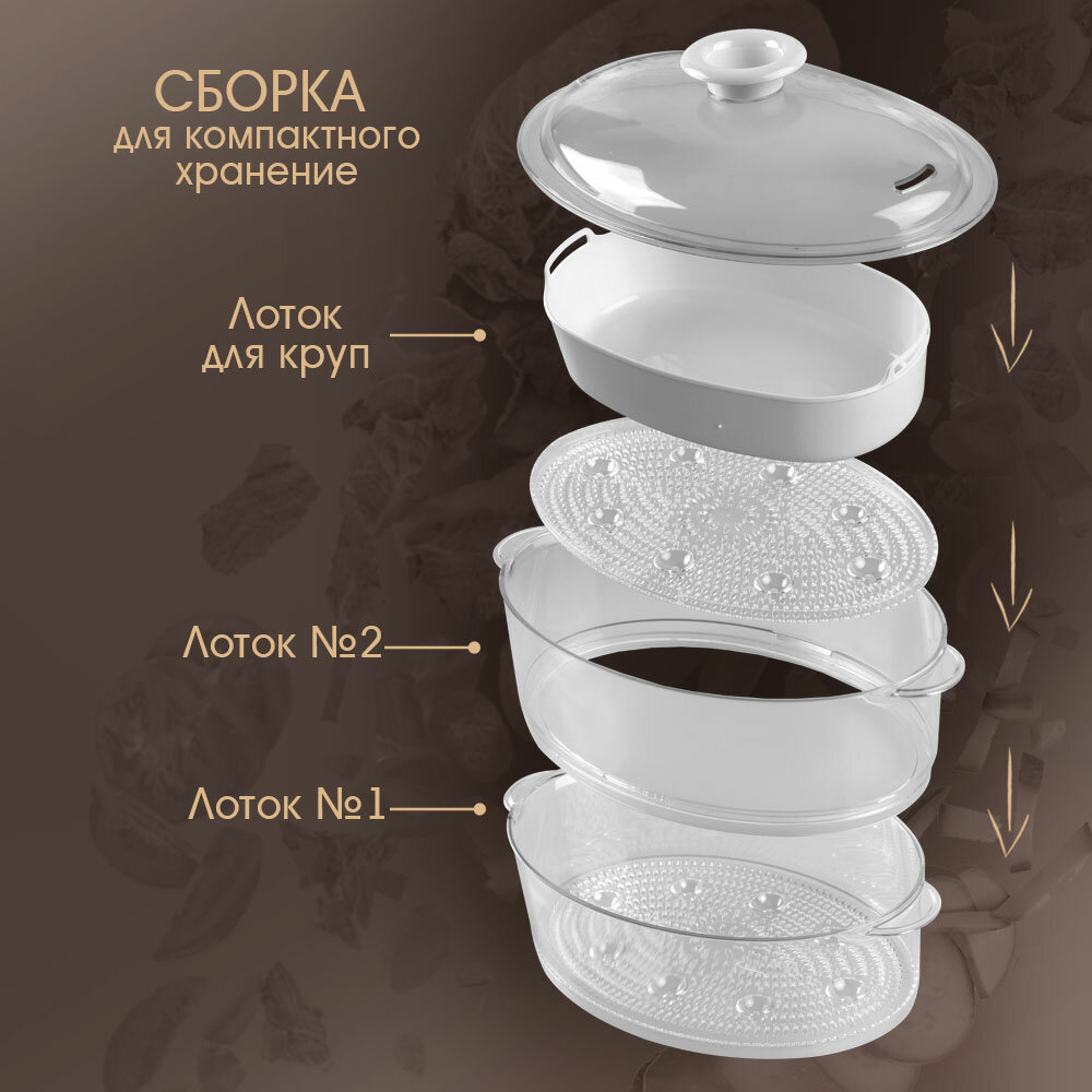 | Особенности конструкции | индикатор включения, индикатор уровня воды, компактное хранение, съемные решетки, чаша для риса |