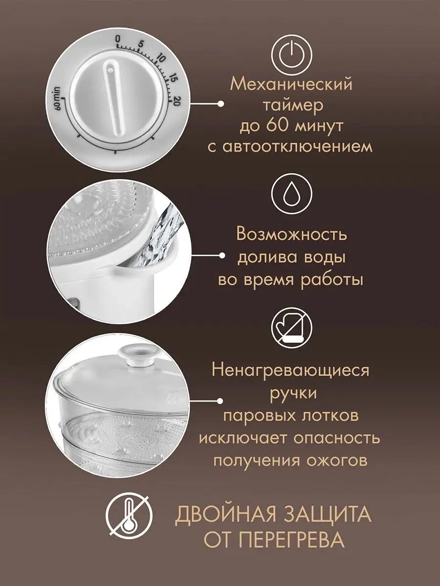 | Особенности | автоотключение по таймеру, долив воды во время приготовления, звуковой сигнал об окончании приготовления, отключение при недостатке воды, таймер |