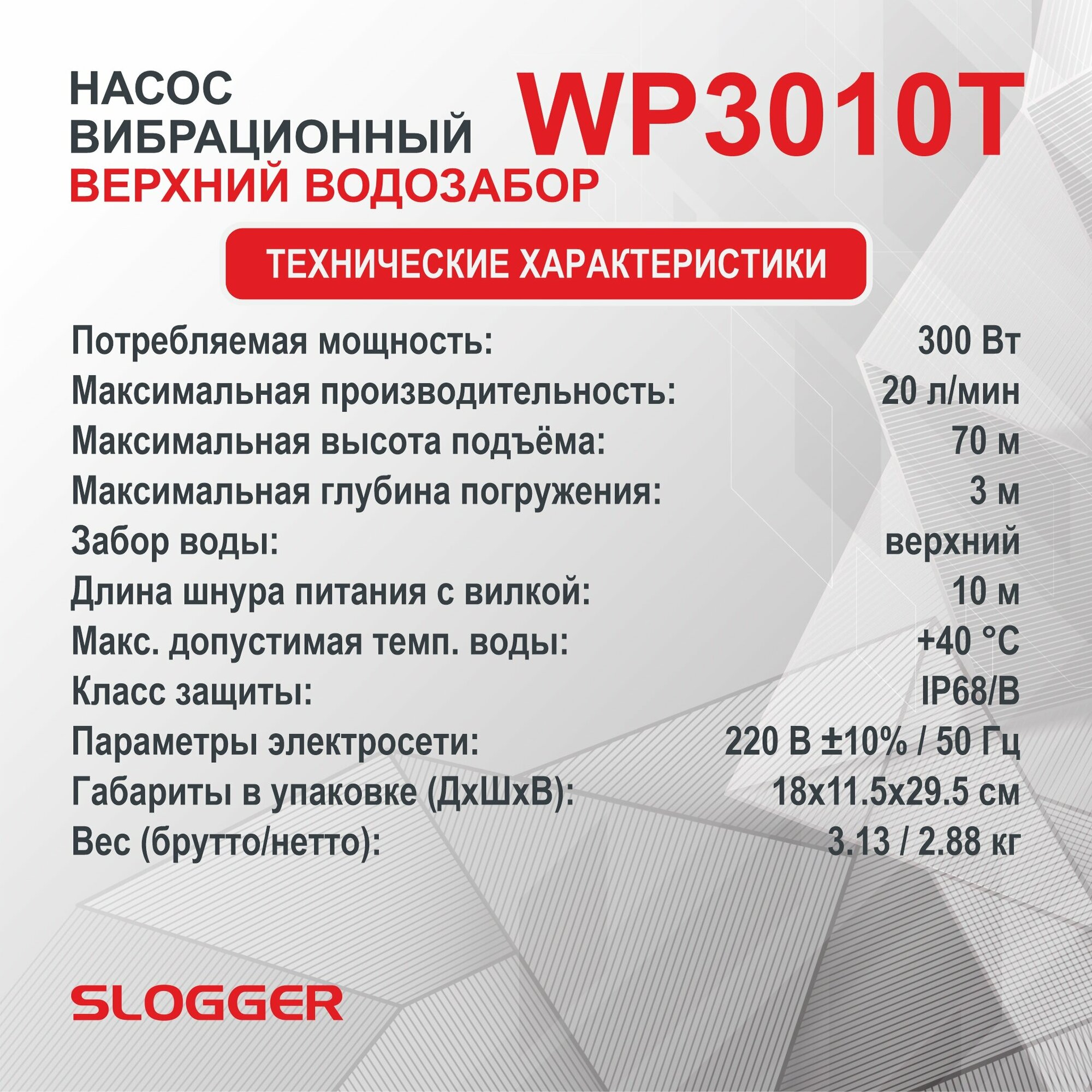Насос вибрационный Slogger WP3010T, 300Вт, 20л/мин, Верхний забор воды интересное: