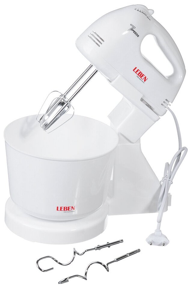 LEBEN Миксер кухонный 100Вт, 7 скоростей, 2 пары насадок, пластиковая чаша 2л