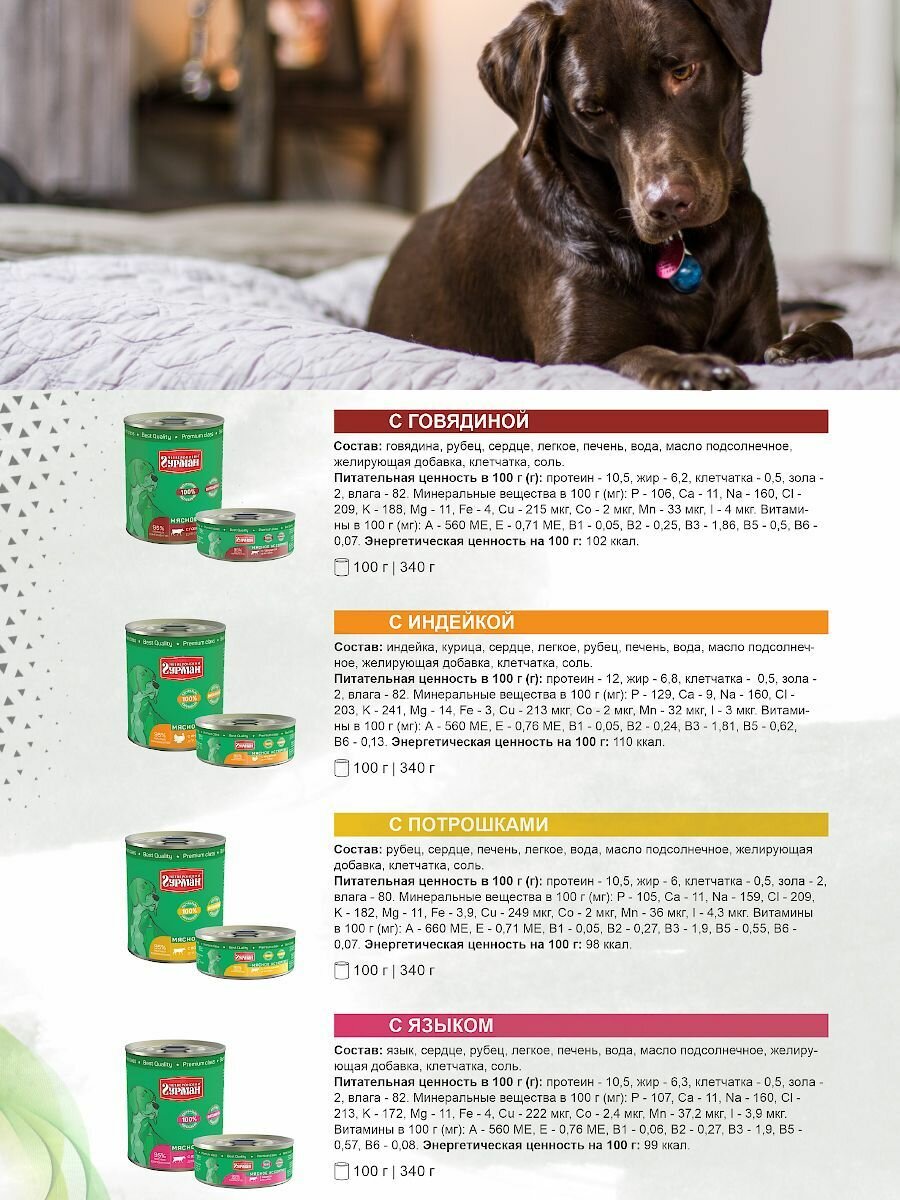 | Отзыв: | Собака цвергпинчер ест с удовольствием,корм пахнет как нормальная тушенка с гречей, а не искуственный мясной корм. |
