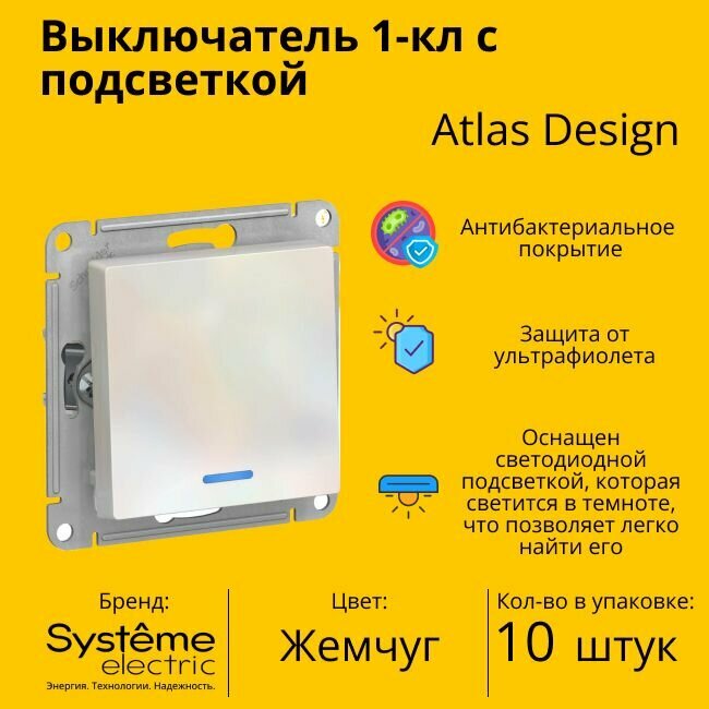 10 шт. Systeme Electric AtlasDesign Песочный Выключатель 1-клавишный с подсветкой, сх.1а, 10АХ, механизм, ATN001213
