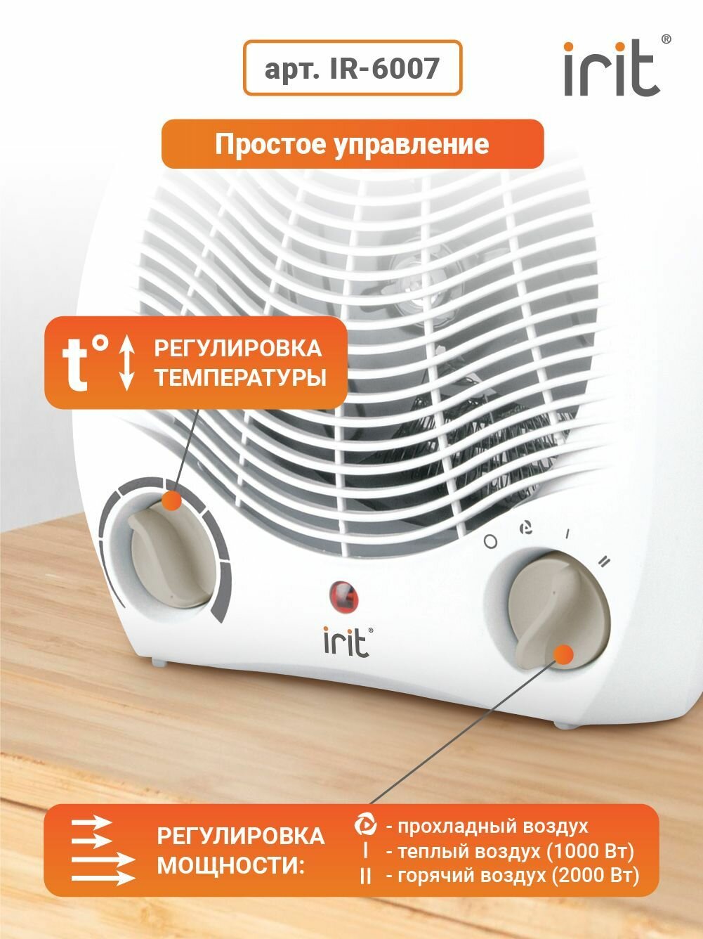 Купить Вентиляторы IRIT Тепловентилятор IRIT IR-6007 регулятор мощности 1000/2000W, с рег. t°, автоотключение