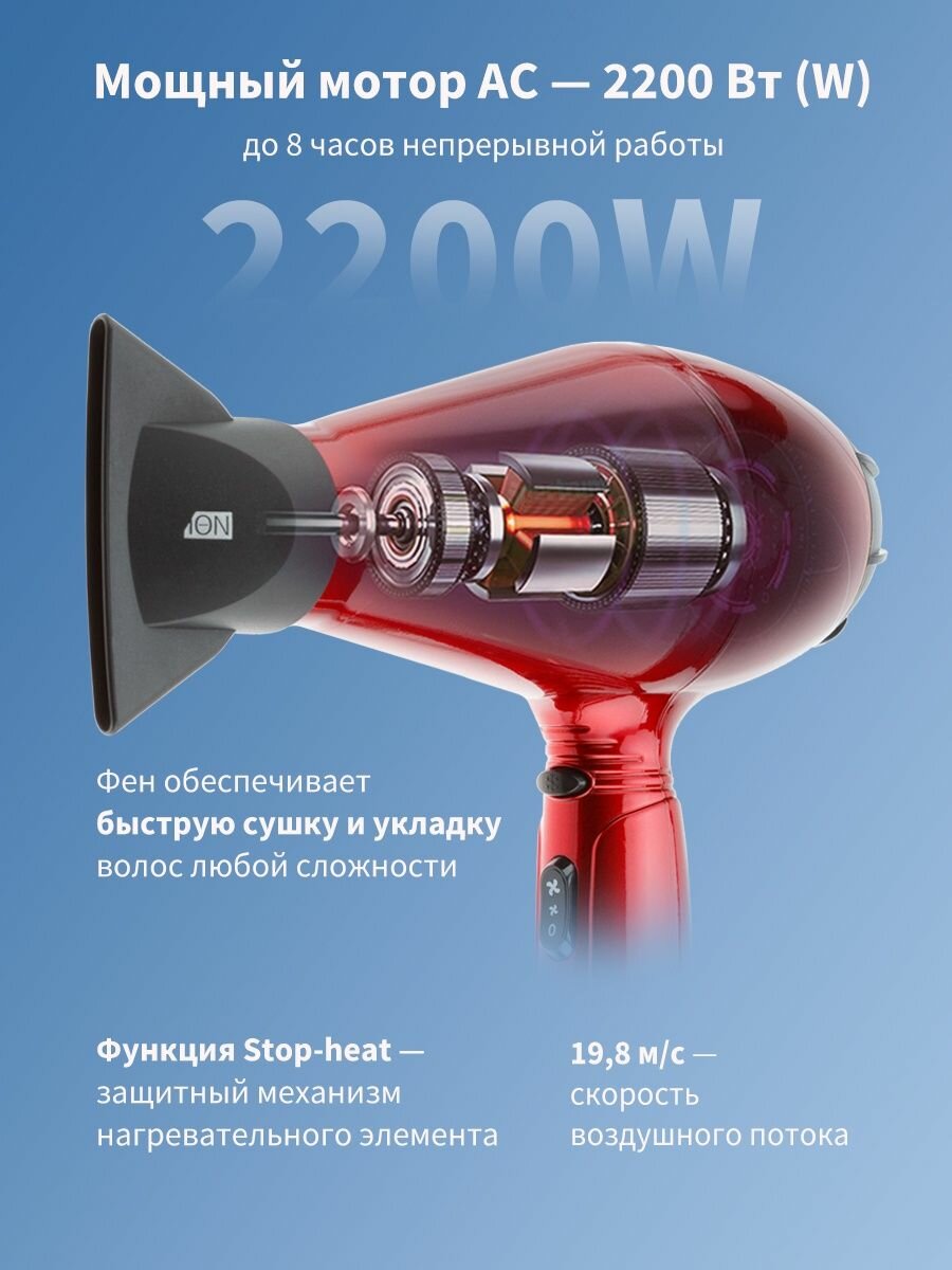 Фен DEWAL PRO SPECTRUM c ионизацией, красный, вес 600 гр, 2200 Вт, 2 насадки, провод 3 м 03-110 Red