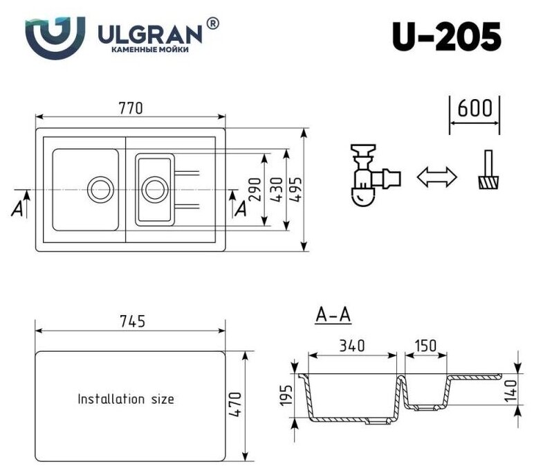 Мойка Ulgran, мрамор, U-205-308, (770*495*195 мм), черный, сифон и сливная арматура